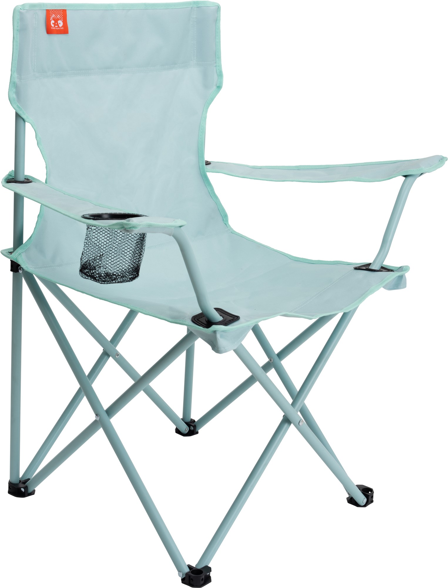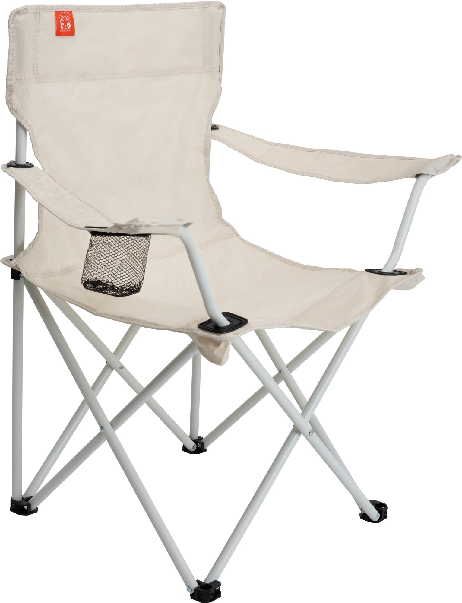 Piétements larges. Haut dossier, larges accoudoirs avec porte-gobelet et housse de transport avec bandoulière. Repliable et léger.
