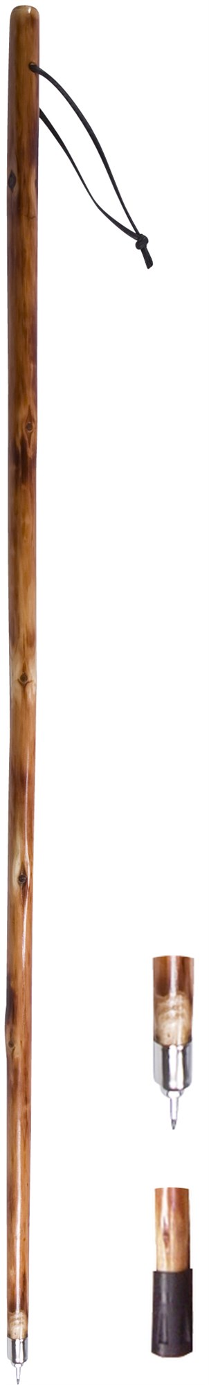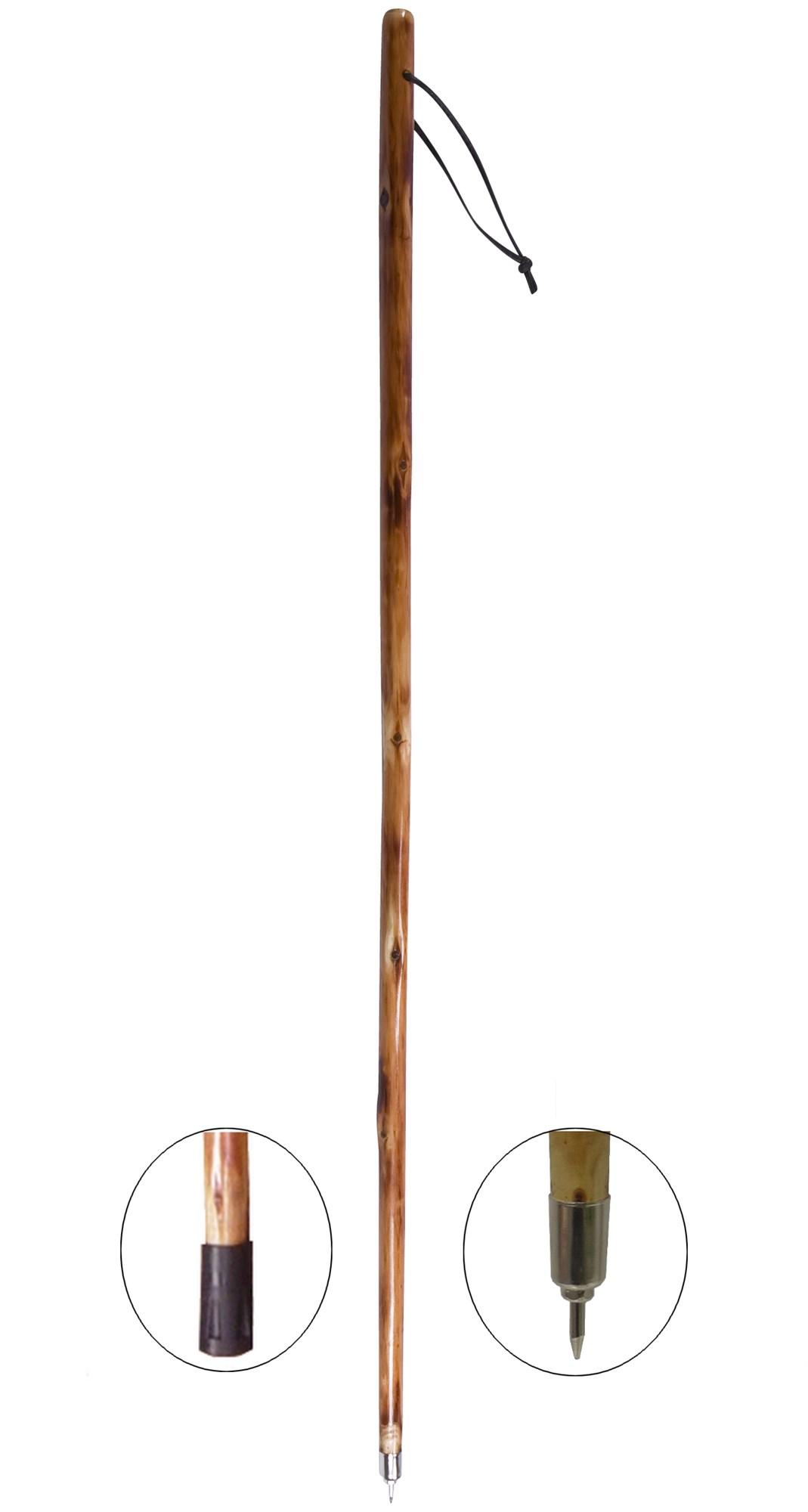 Ce bâton, fabriqué en pin avec une finition vernie, offre à la fois robustesse et résistance à l’humidité. Il est équipé d’une pointe métallique pour une accroche optimale au sol, ainsi que d’un embout en caoutchouc amovible pour un confort d’utilisation sur terrain dur. Une dragonne intégrée assure une prise en main confortable et sécurisée.