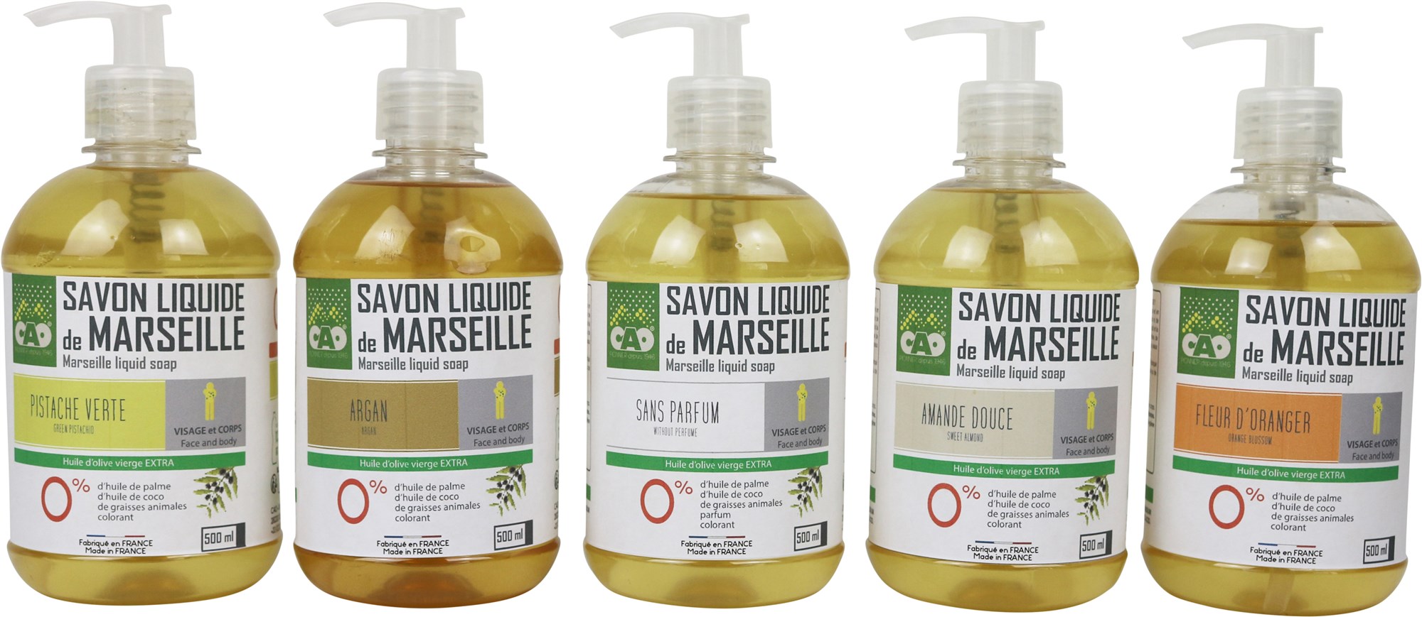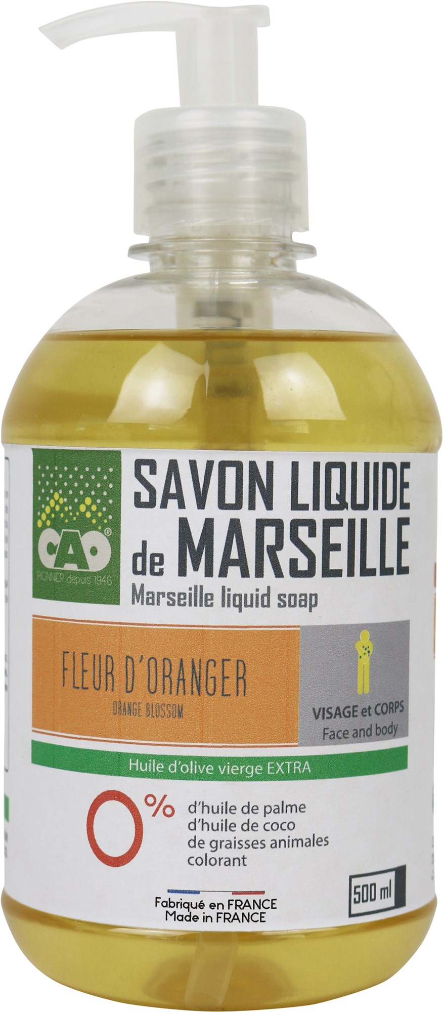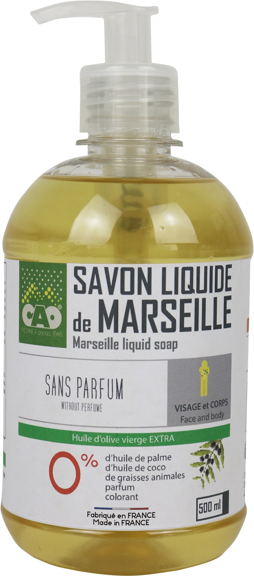 Savons de Marseille liquide 500 ml en Aqua, potassium olivate, glycerin, potassium hydroxyde, olea europaea fruit oil, parfum, citric acid. | Ref. 5017