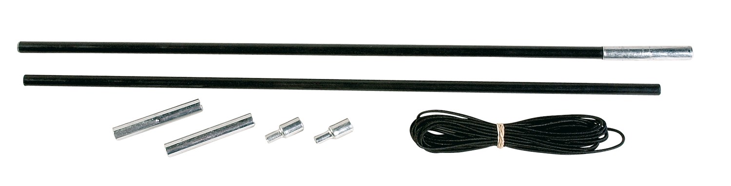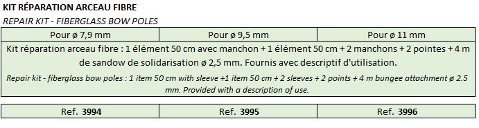 Kit réparation arceau fibre pour ø 7,9 mm : 1 élément 50 cm avec manchon + 1 élément 50 cm + 2 manchons + 2 pointes + 4 m de sandow de solidarisation ø 2,5 mm. Fournis avec descriptif d'utilisation...