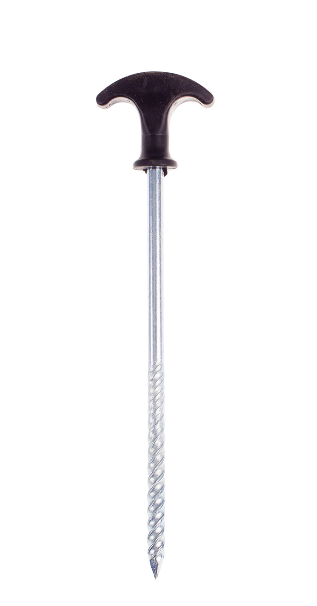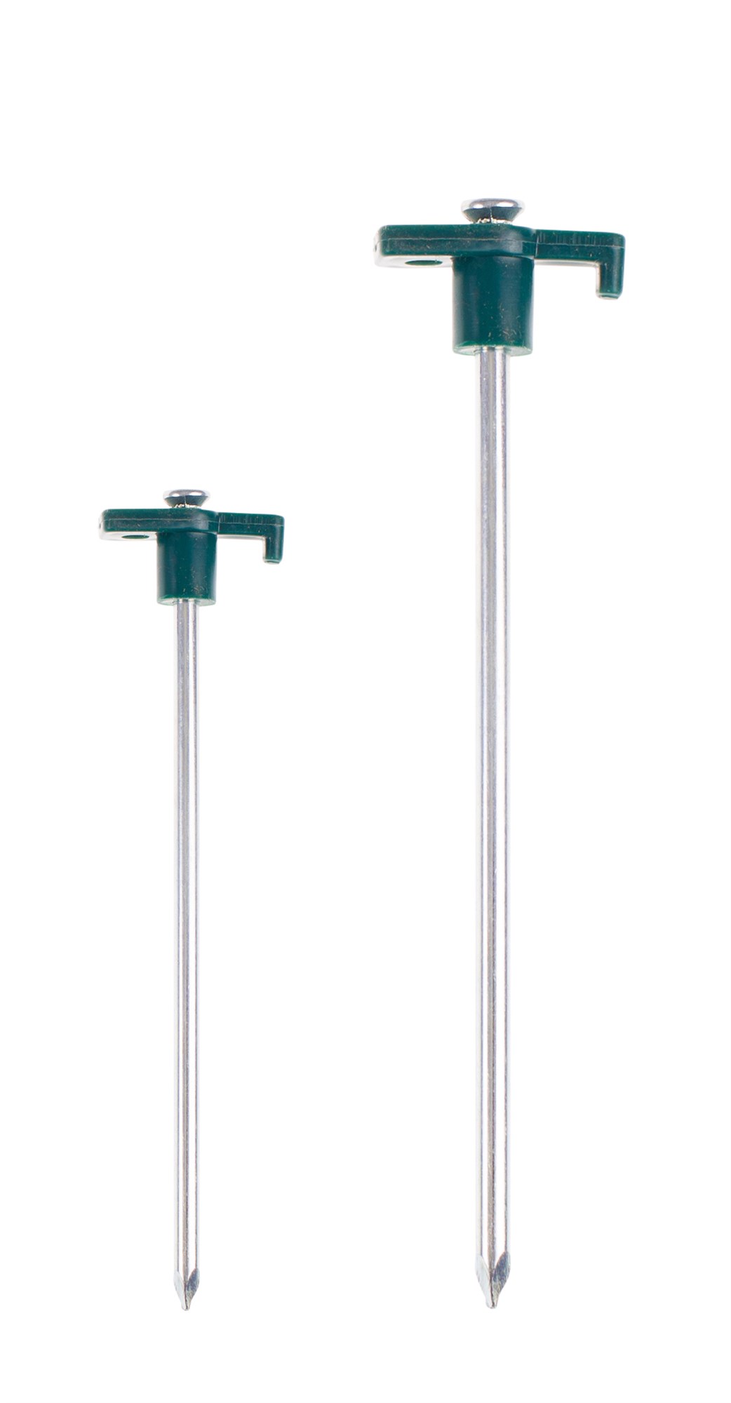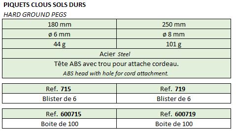 Forme de clou, tête ABS avec trou pour attacher les cordeaux. Type de sol : Sols durs et compacts. Type de vent : Fort. Utilisation : Fixation tentes lourdes et auvents. Avantage : Pointe affûtée pour une meilleure pénétration. Inconvéniant : Moins adaptés aux sols meubles.