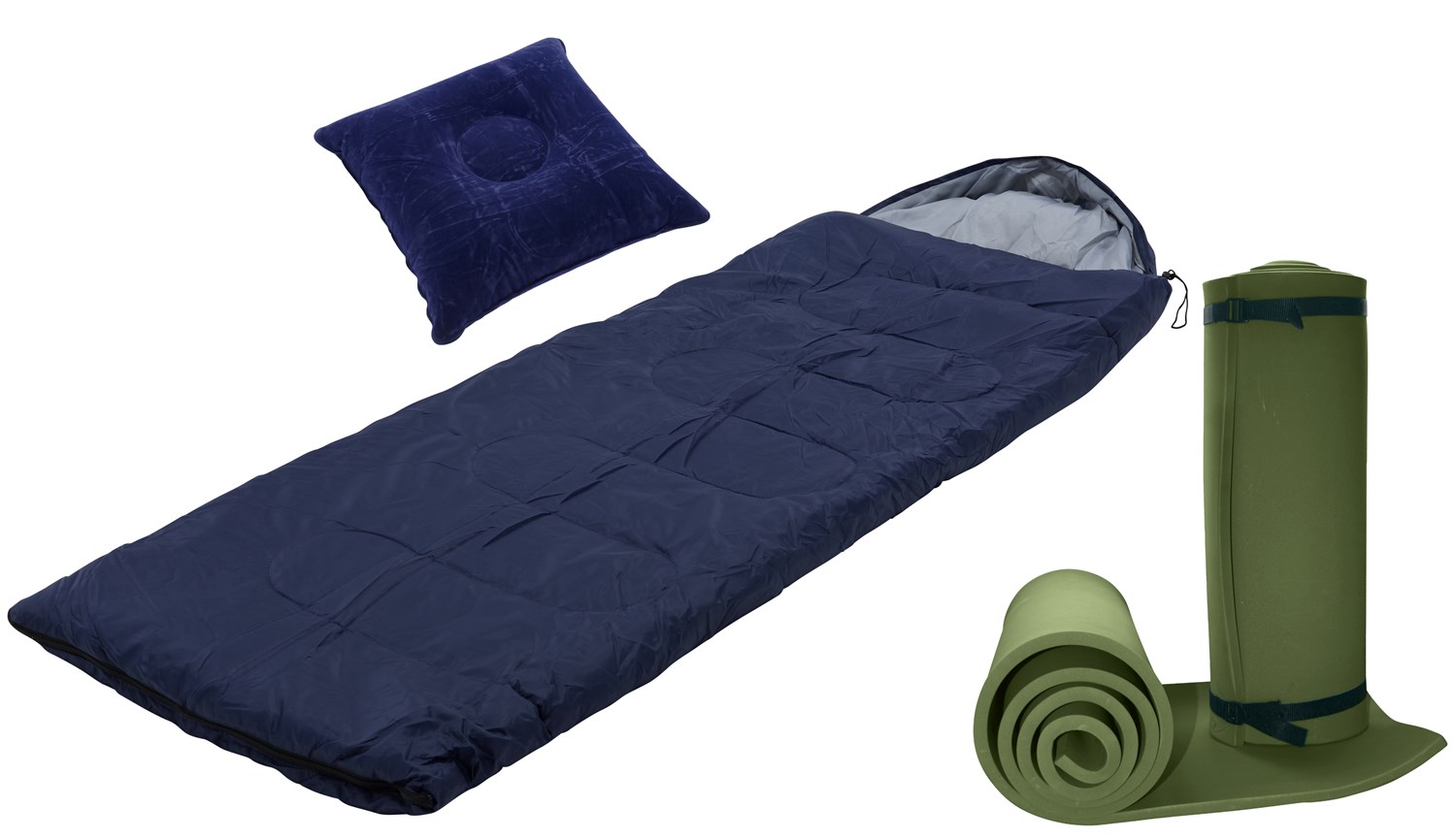 Kit de couchage comprenant un matelas matmouss épais de 1,2 cm, un sac de couchage (température confort +10°C / température limite +1°C) et un oreiller floqué. Fourni avec une housse de rangement.