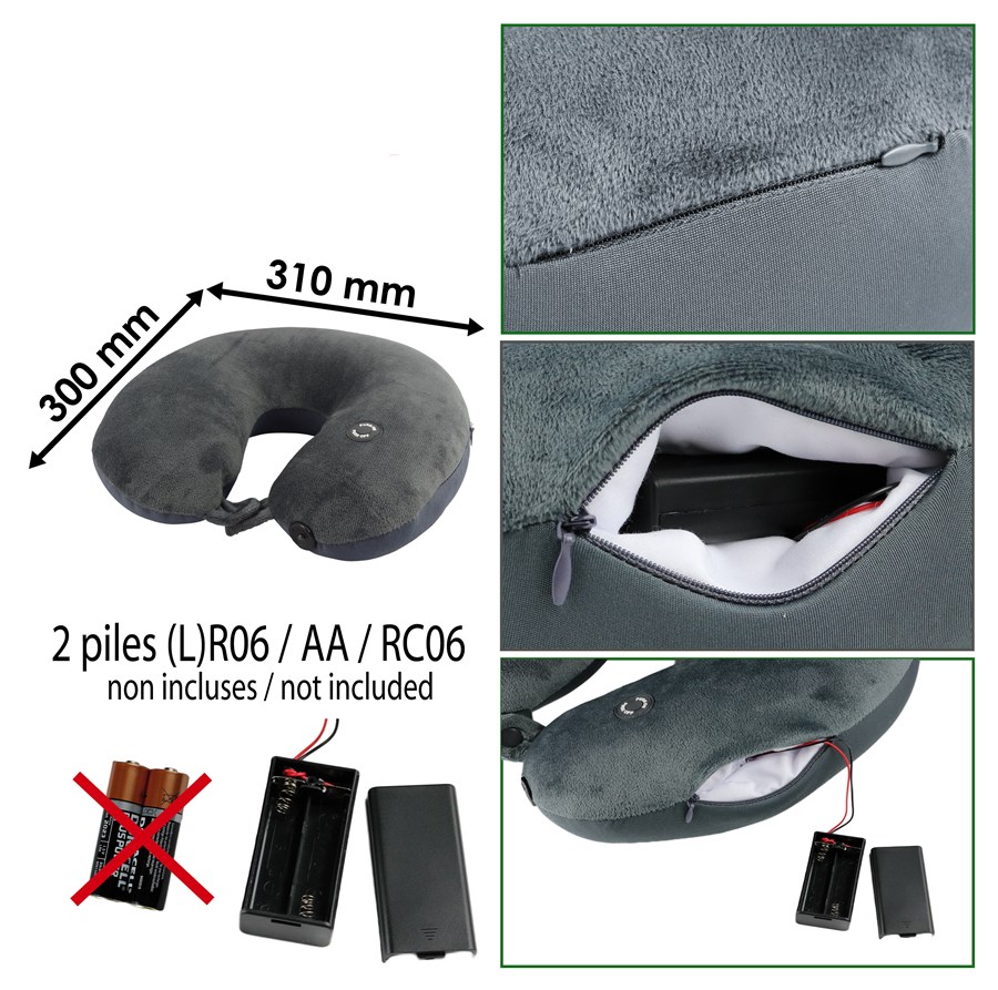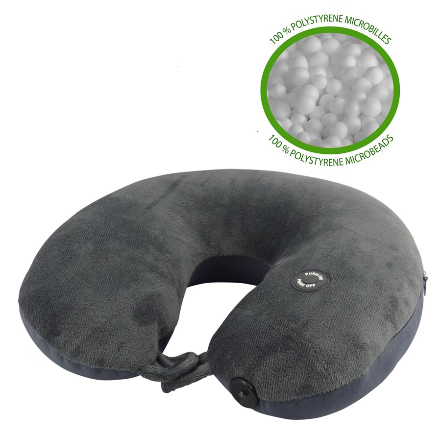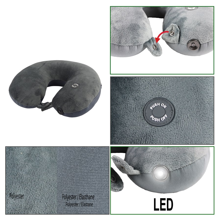 Oreiller de voyage avec led Dessus : 90% Polyester, 10% Elasthanne Dessous : 100% Polyester Garnissage : microbilles Gris anthracite 30 x 31 cm Oreiller de forme ergonomique en U avec lampe de lecture à LED intégrée. Confortable et toucher doux. Interrupteur marche/arrêt. Pour vous reposer ou pour lire, il atténue la fatigue du voyage. 1 led LR6 (AA) 1,5 V x2 non incluses 160 g