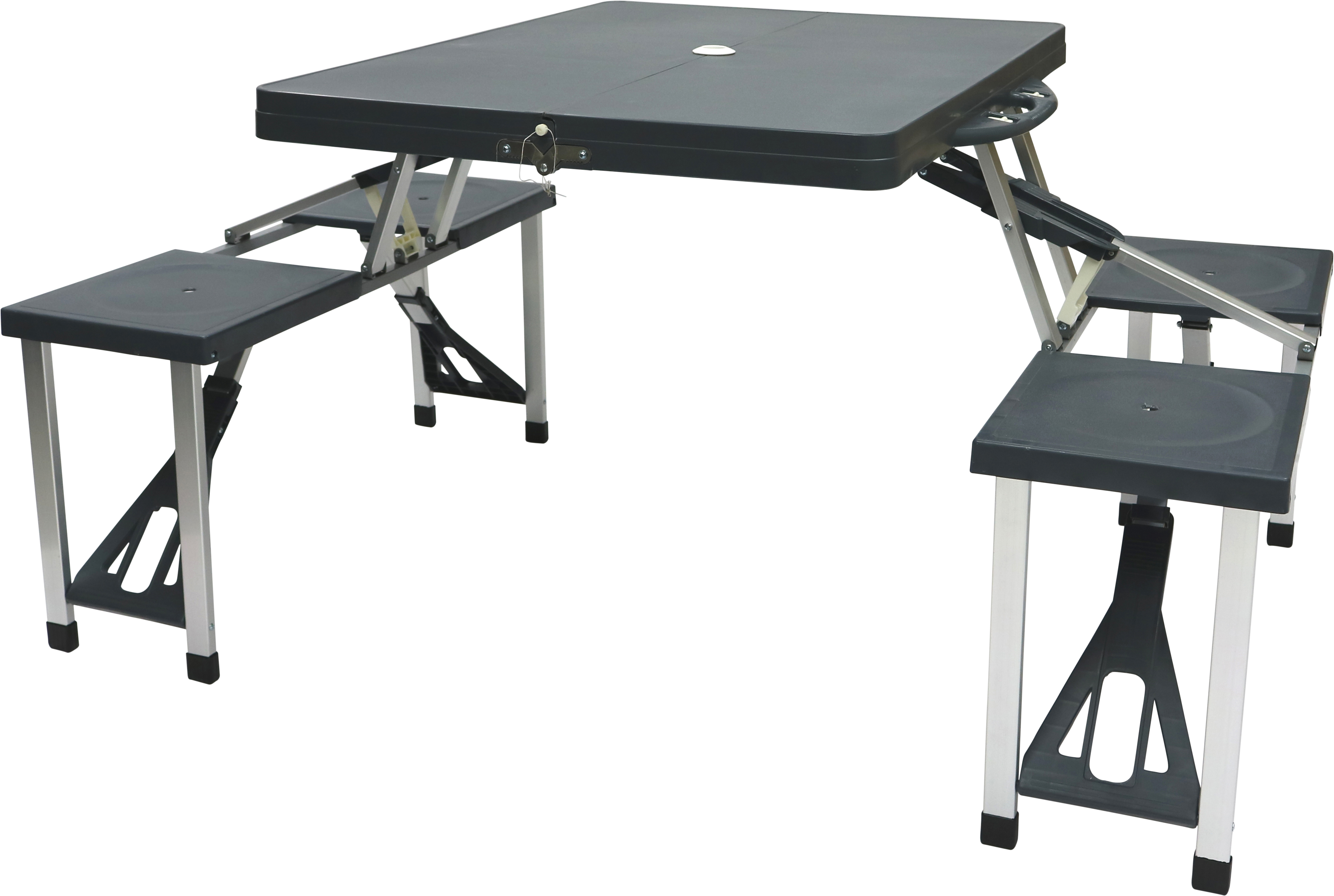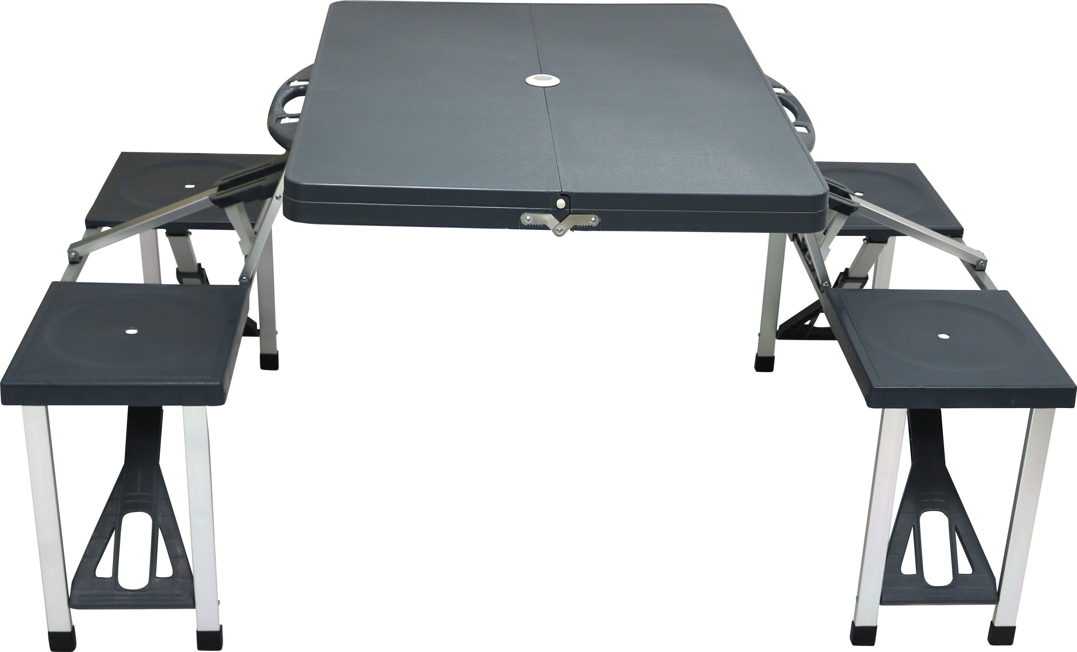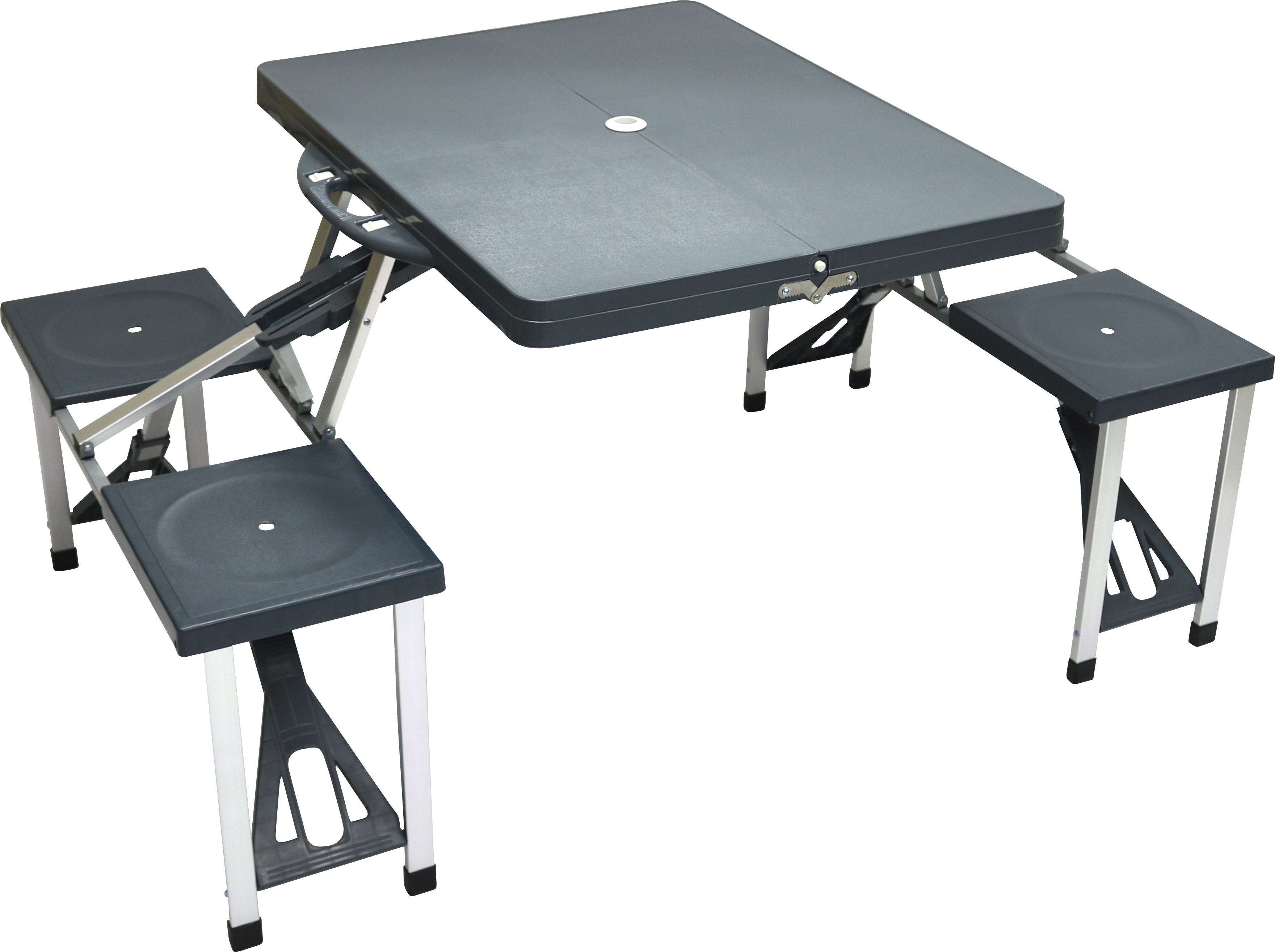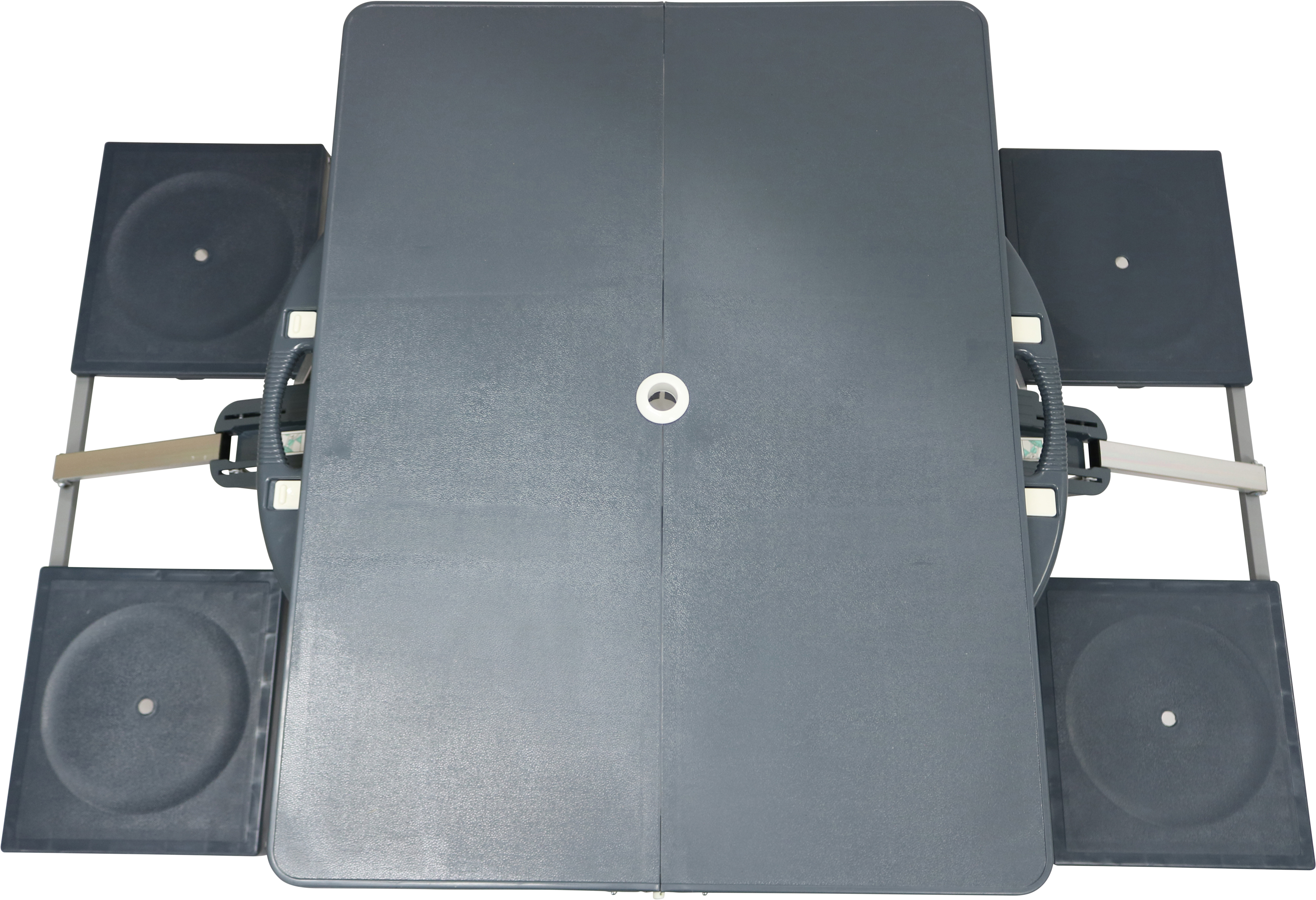 Se replie en mallette avec les 4 sièges solidaires à l'intérieur. Faible volume de rangement. Trou central pour parasol.