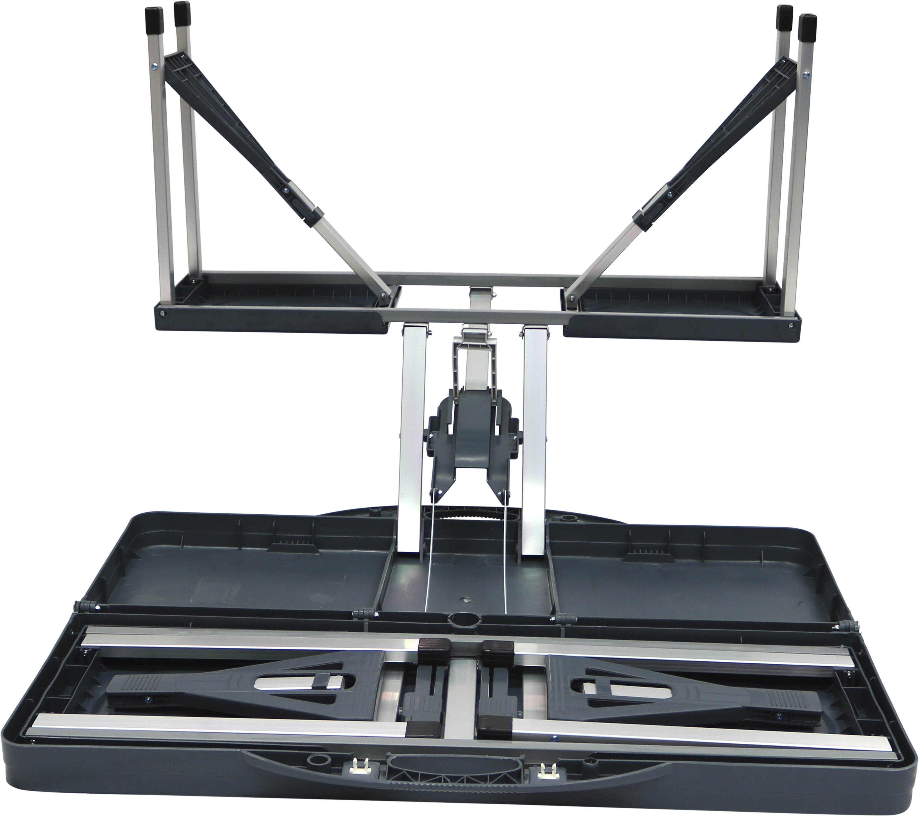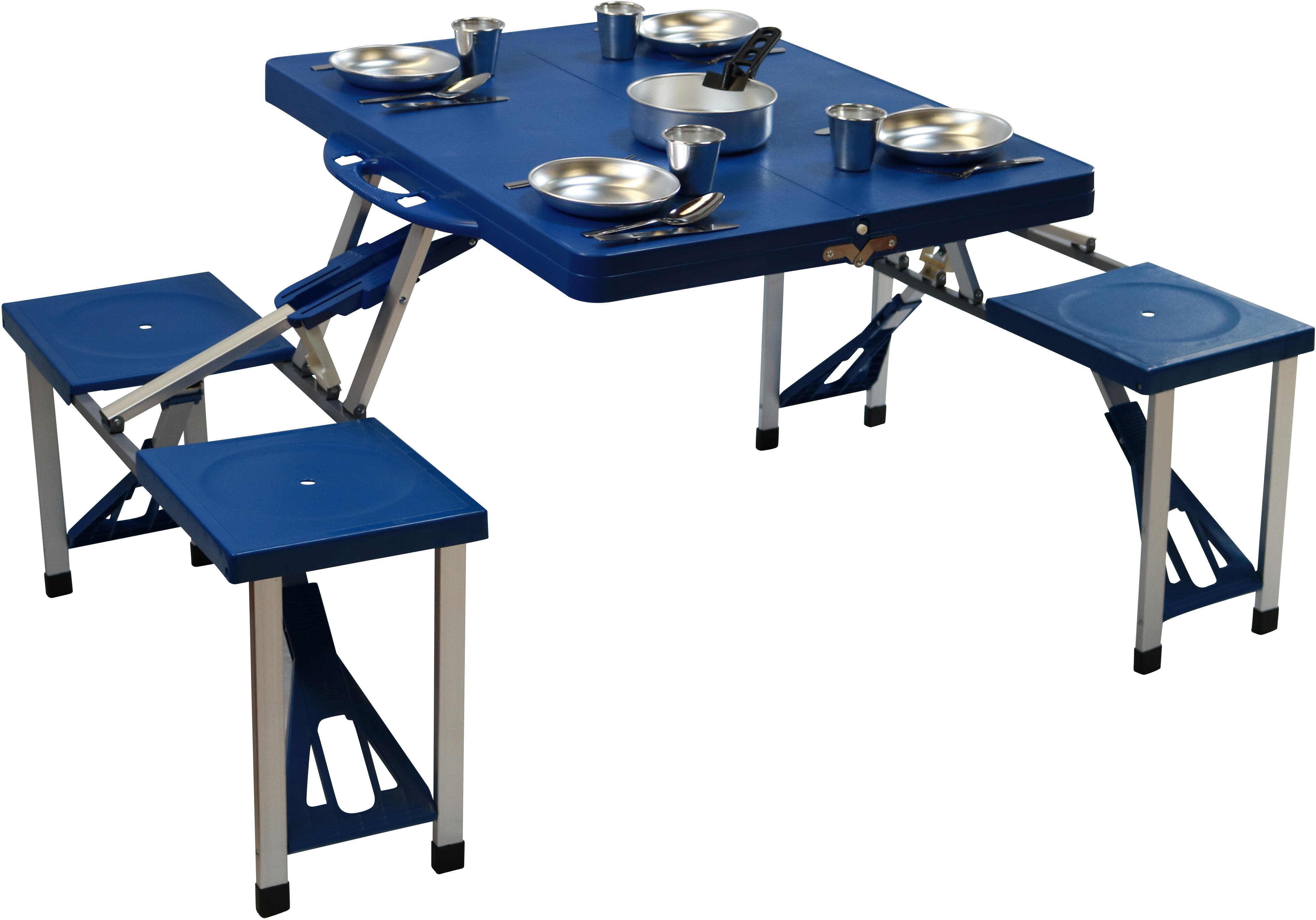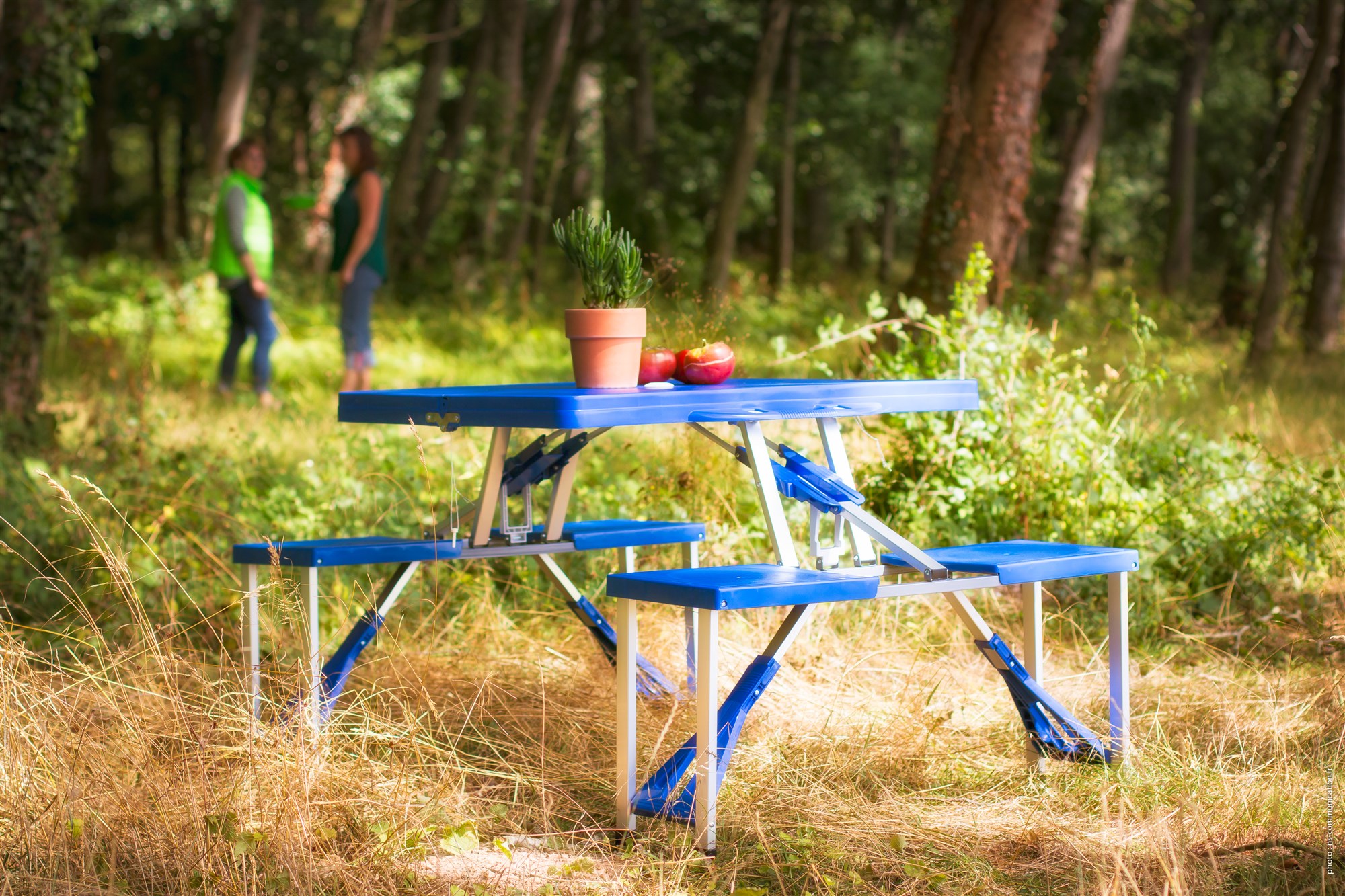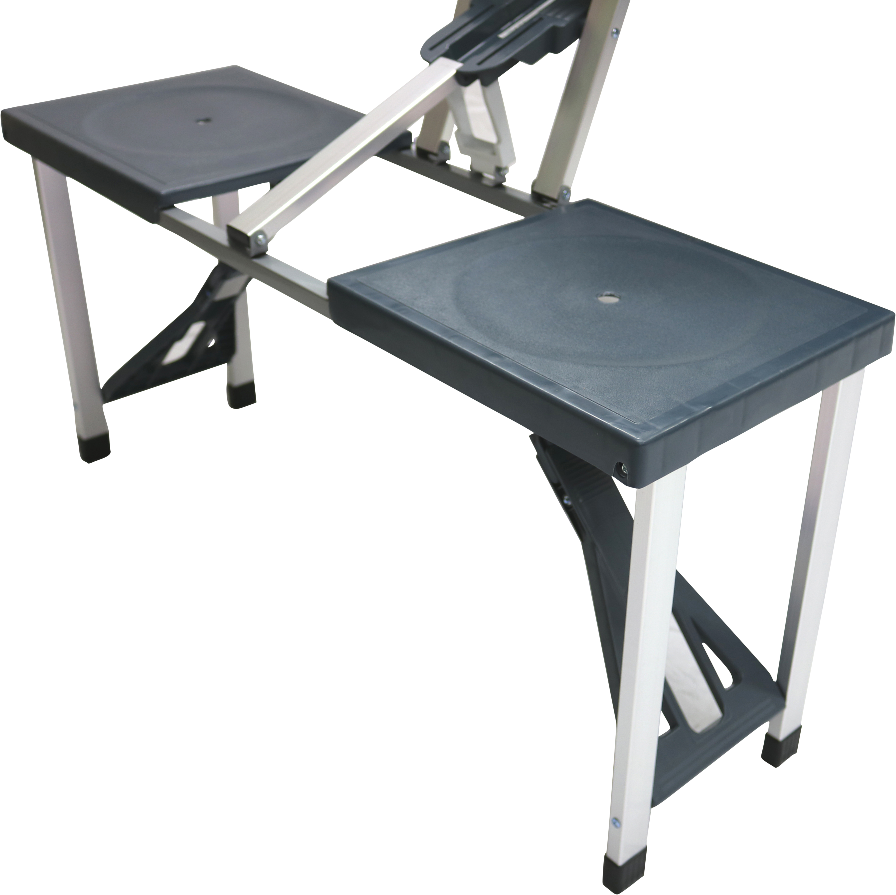 Se replie en mallette avec les 4 sièges solidaires à l'intérieur. Faible volume de rangement. Trou central pour parasol.
