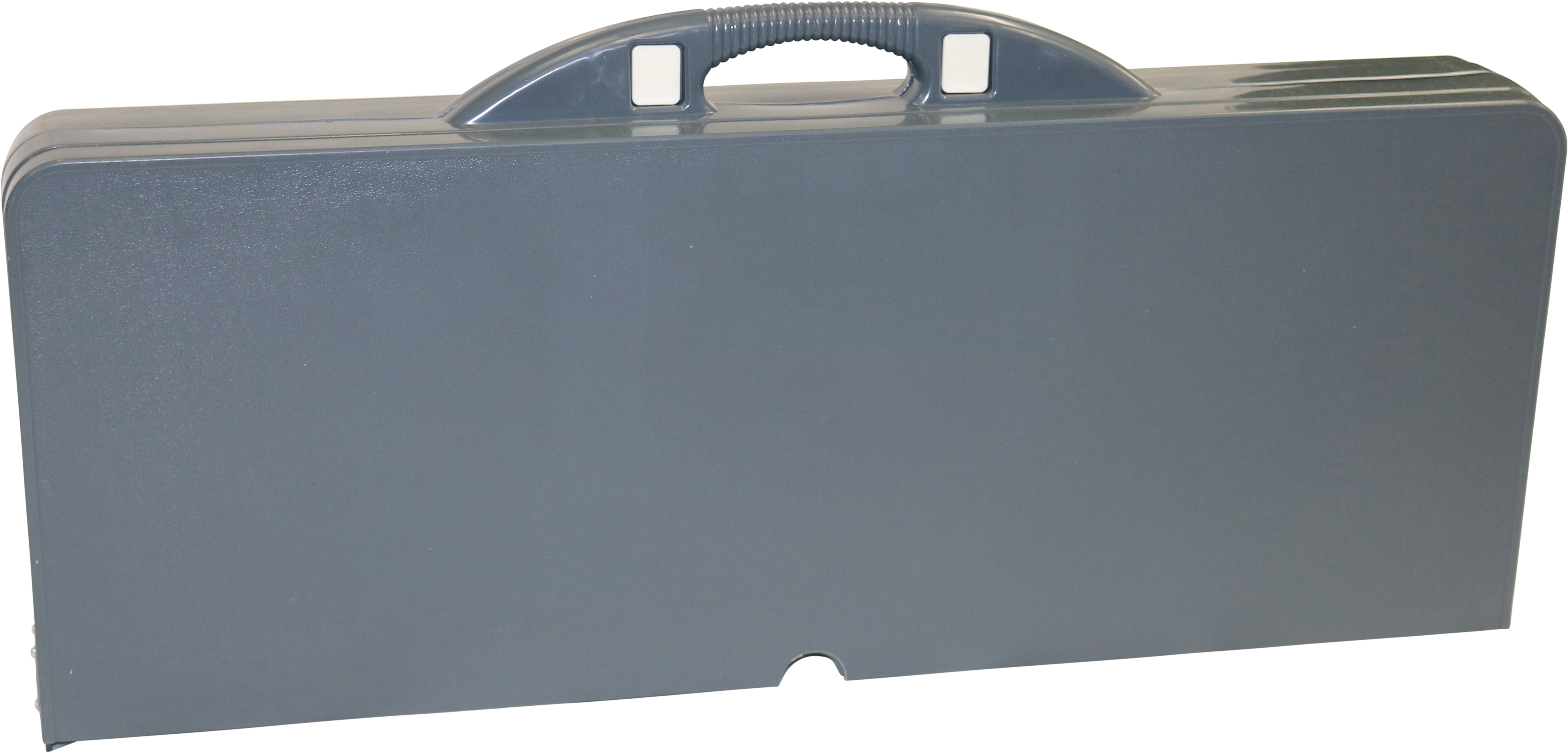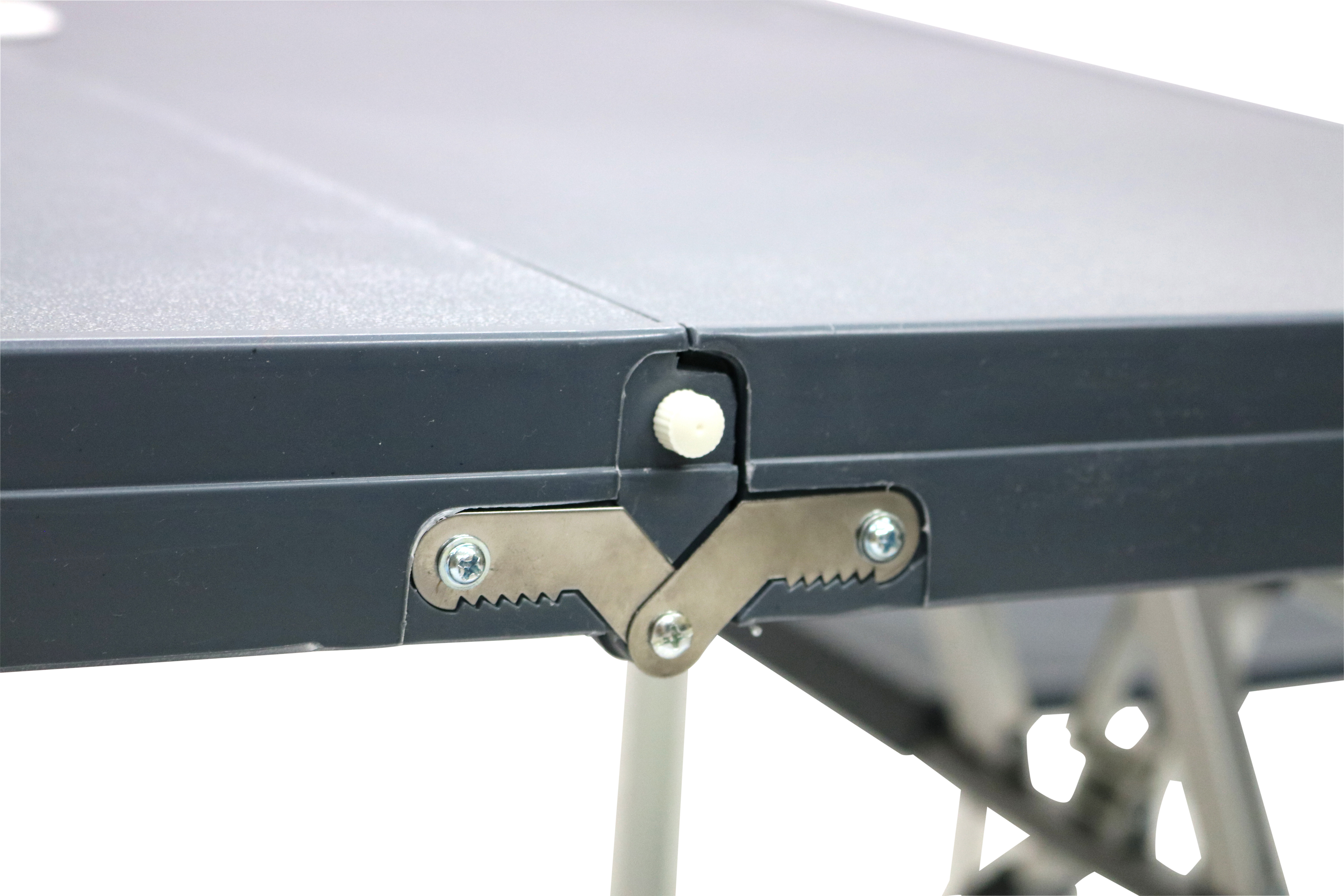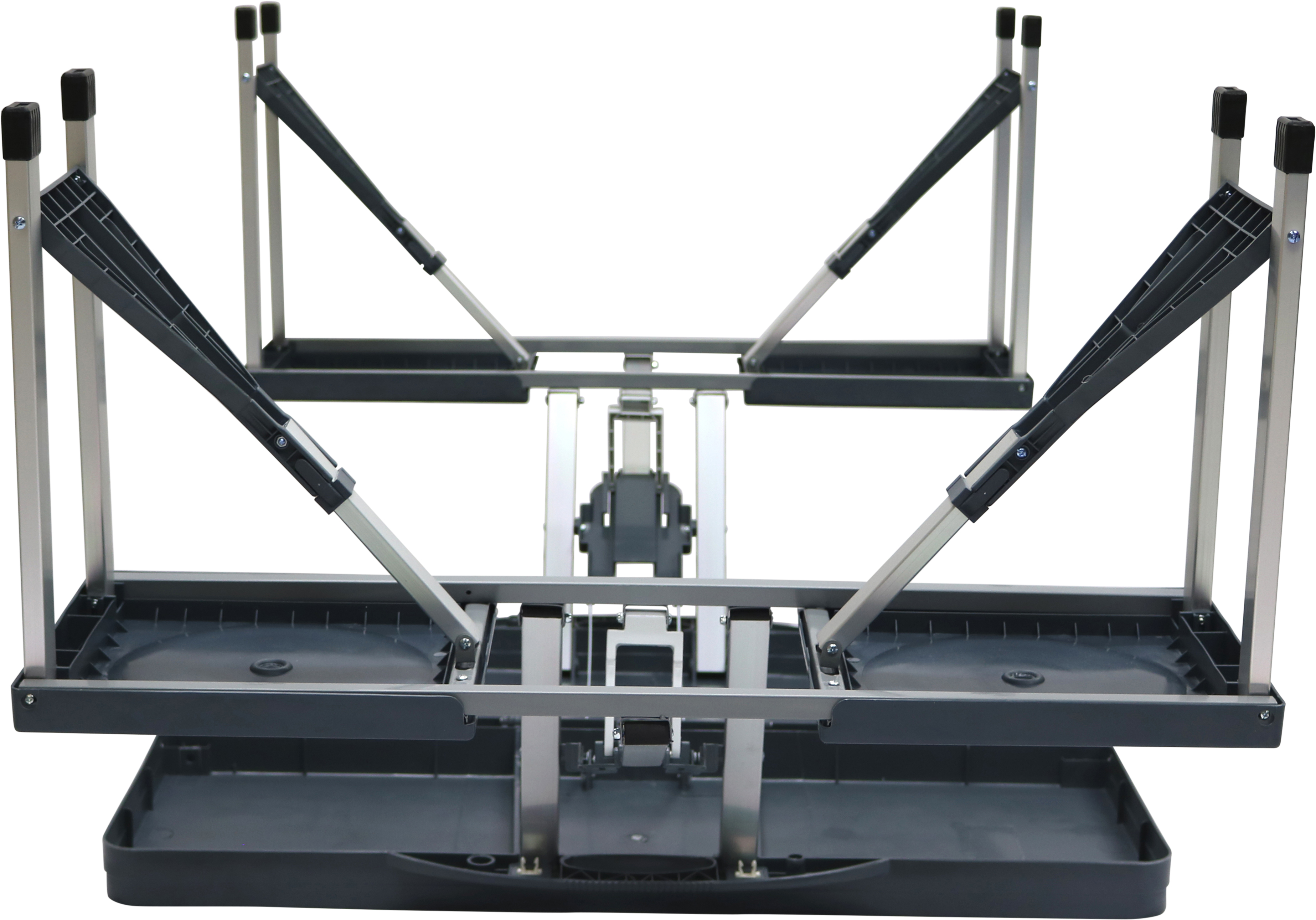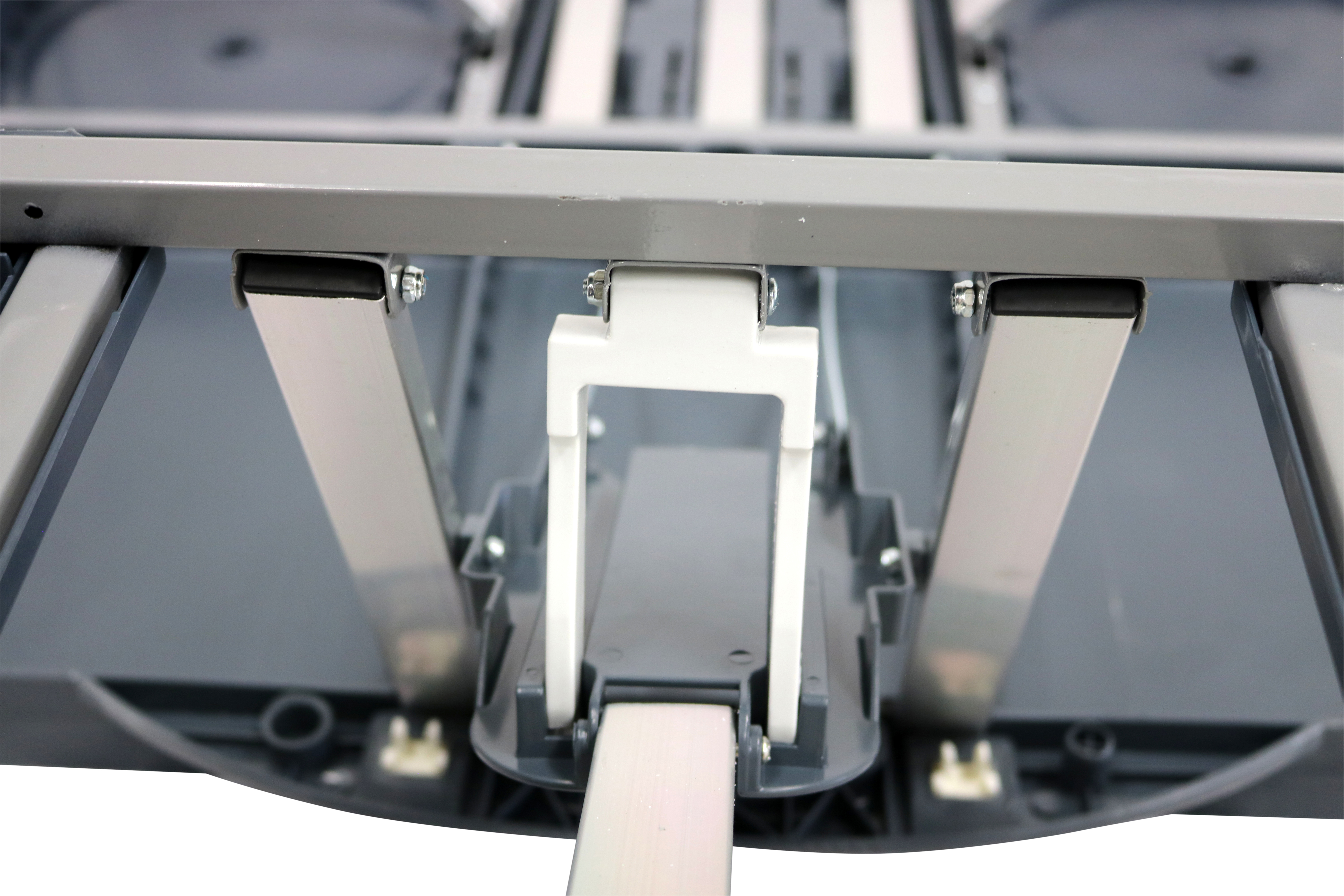 Se replie en mallette avec les 4 sièges solidaires à l'intérieur. Faible volume de rangement. Trou central pour parasol.