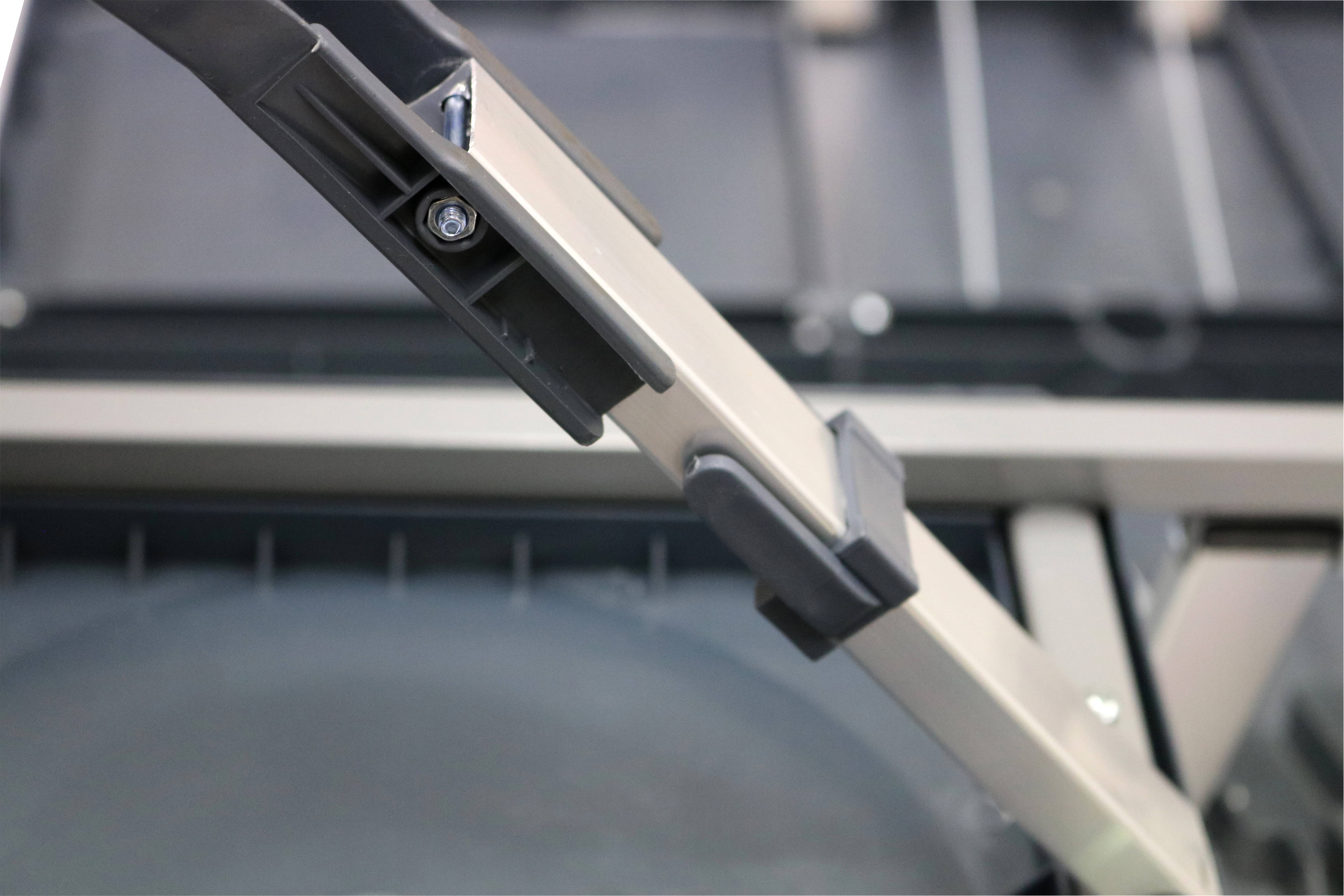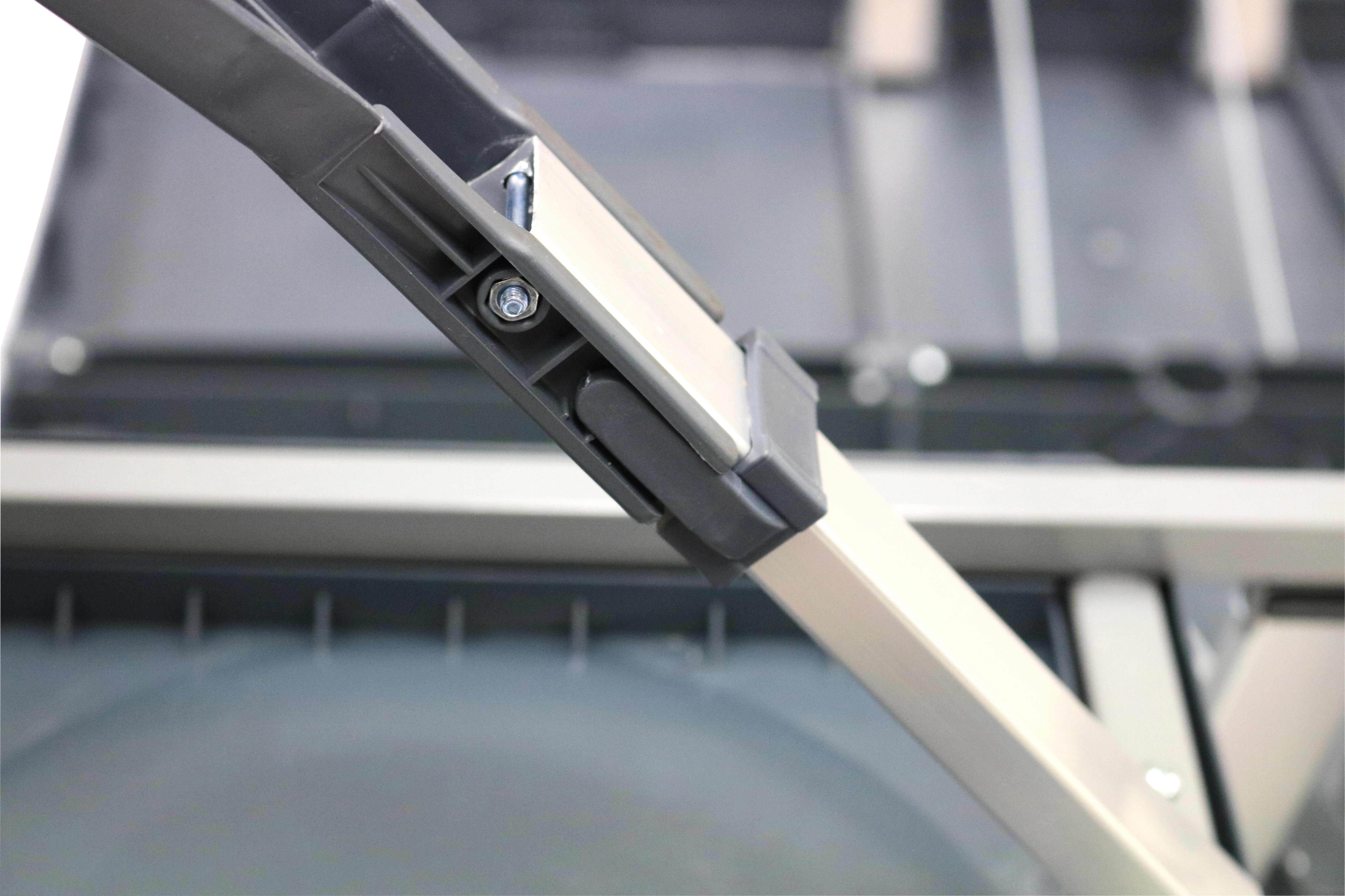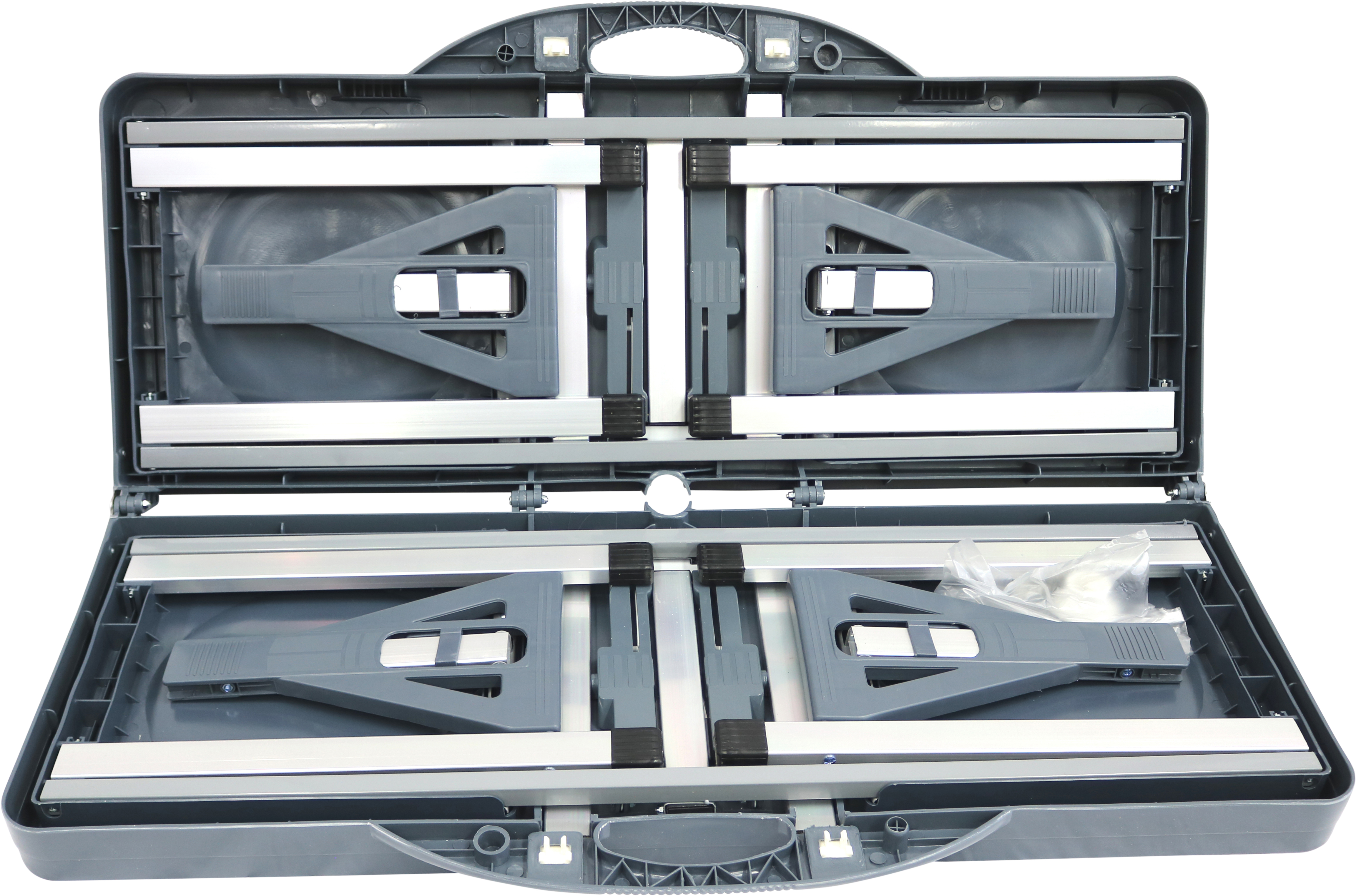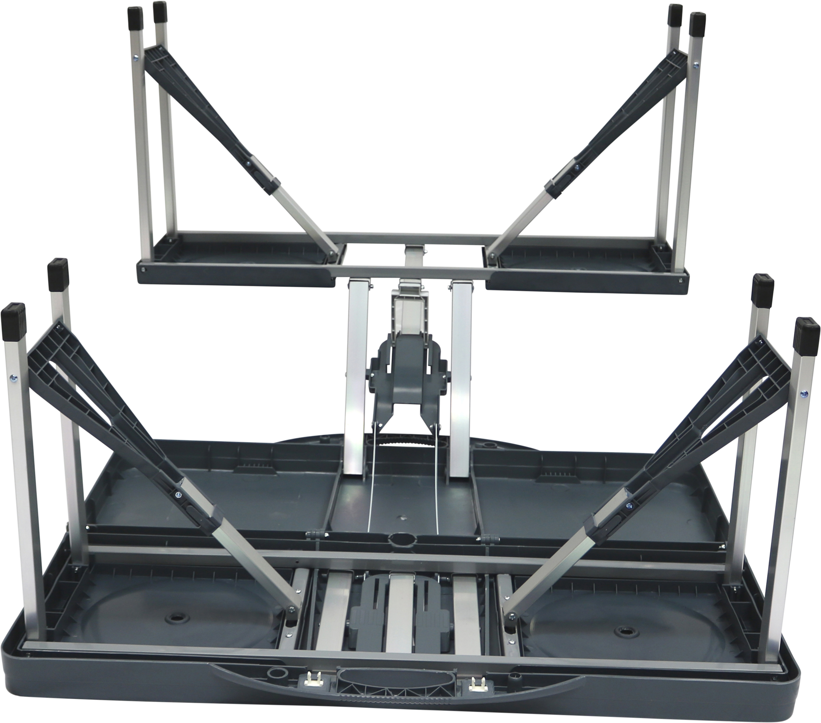 Se replie en mallette avec les 4 sièges solidaires à l'intérieur. Faible volume de rangement. Trou central pour parasol.