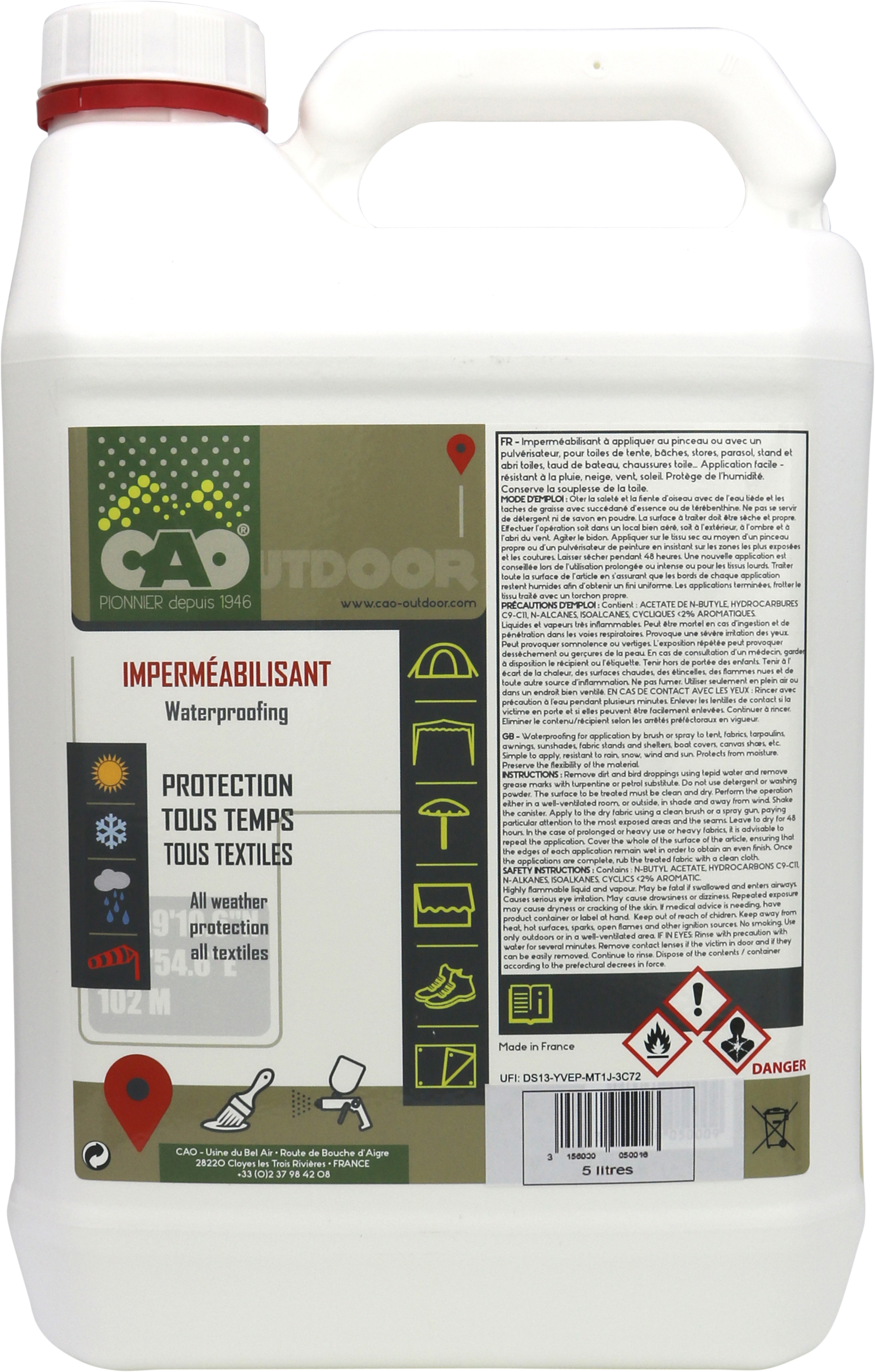 Protection tous temps tous textiles. Efficacité dans le temps et résistance à l'action des agents dégradants de l'atmosphère (pluie, vent, soleil, neige). Fabrication française. Pour tentes, auvents, stores, stands et abris toile, taud de bateau, bâches, parasols, chaussures toile,...