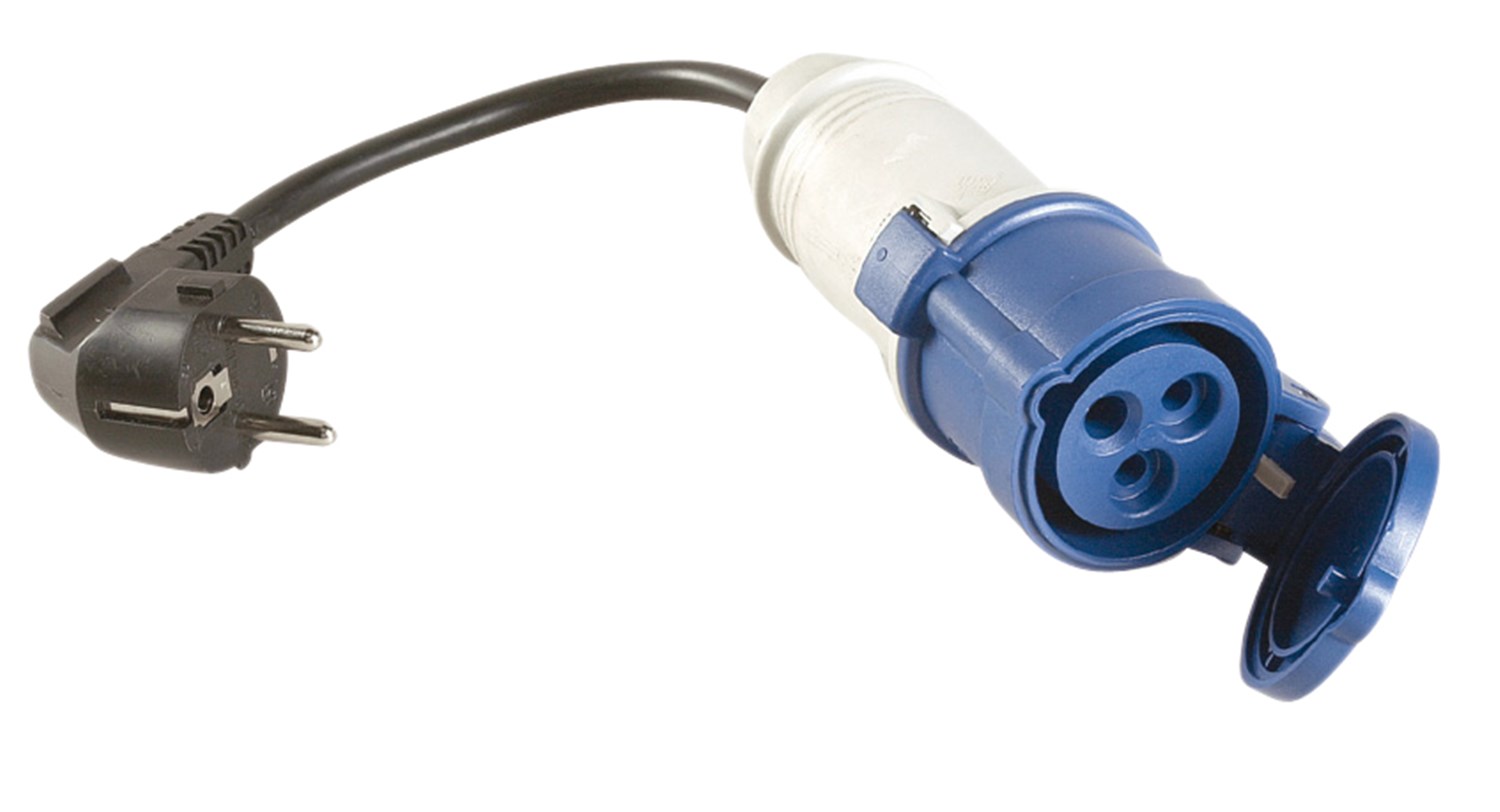 Cordon adaptateur pour branchement côté borne en fiche femelle standard Français (domestique) 2 pôles + terre 10/16A, sortie sur fiche mobile mâle 2 pôles + terre 16A CEI.