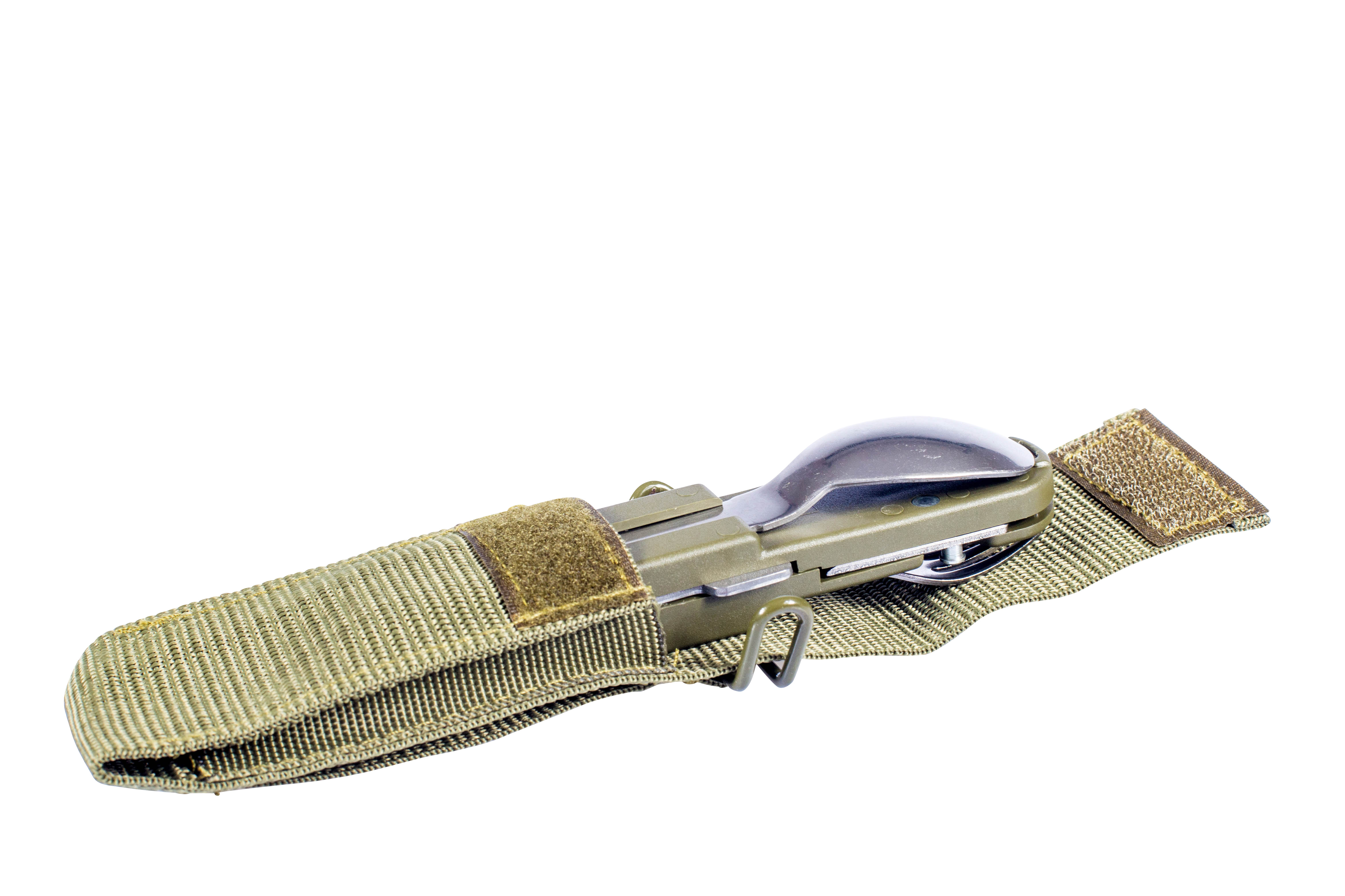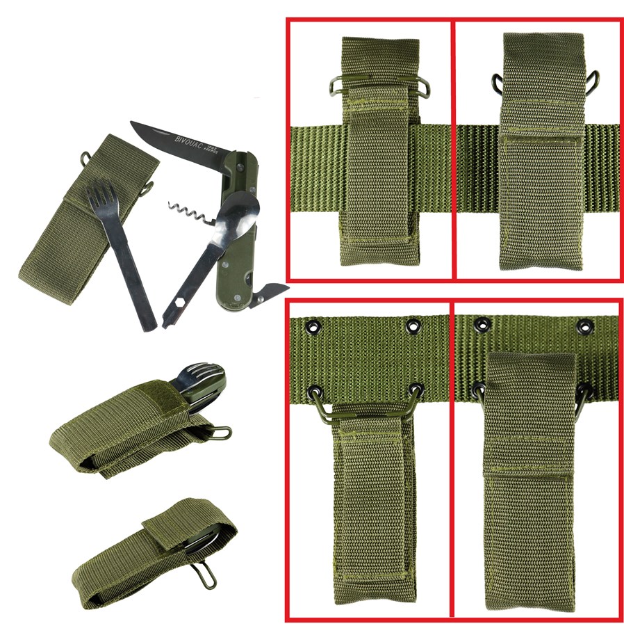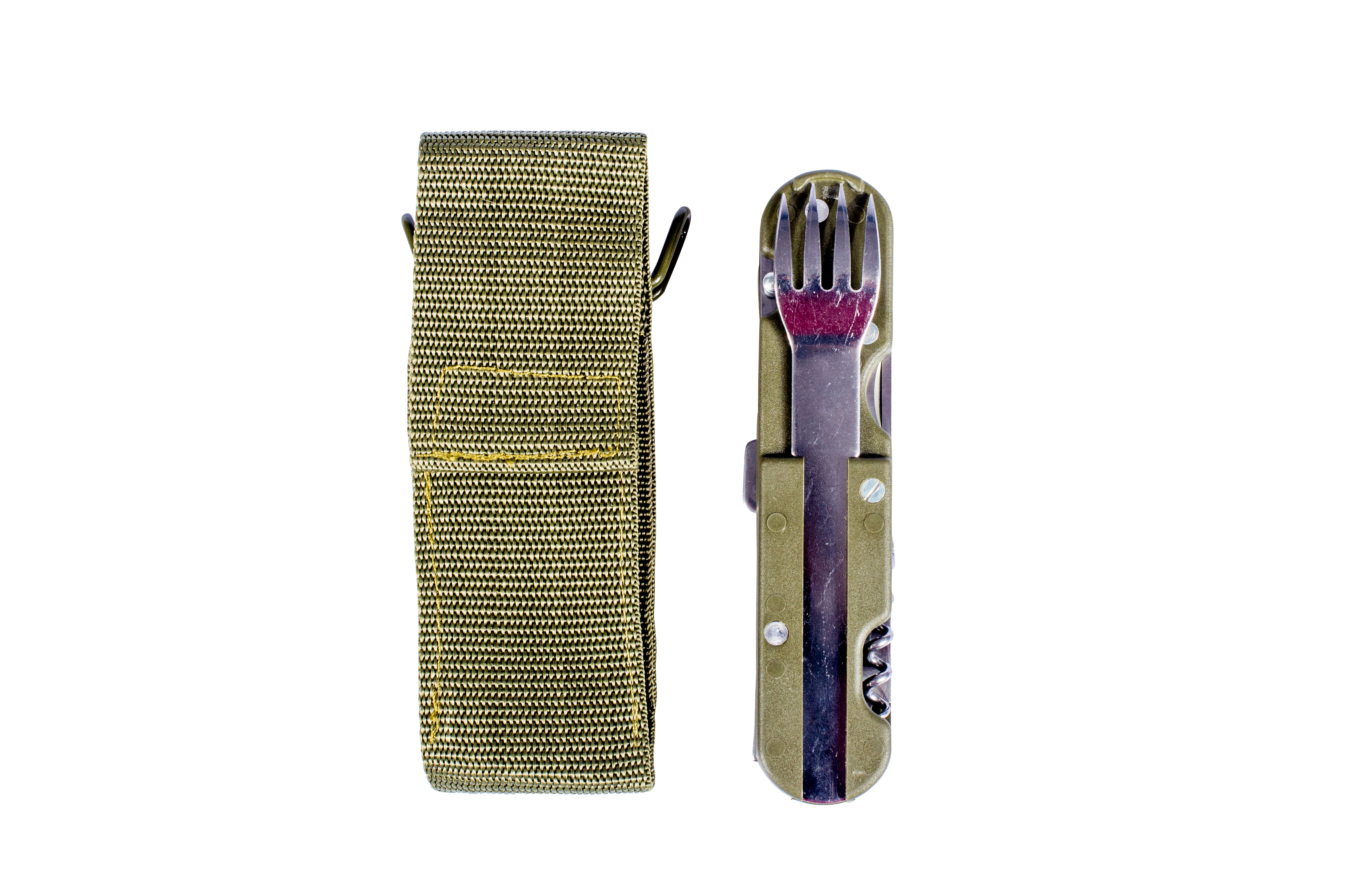 Modèle massif lame 20/10 mm. Cran de sécurité, couteau, fourchette et cuillère détachables, ouvre-boîte affûté avec perce-boite, tire bouchon 5 spires, étui- toile renforcée avec passant ceinture et crochet métallique pour ceinturon armée.