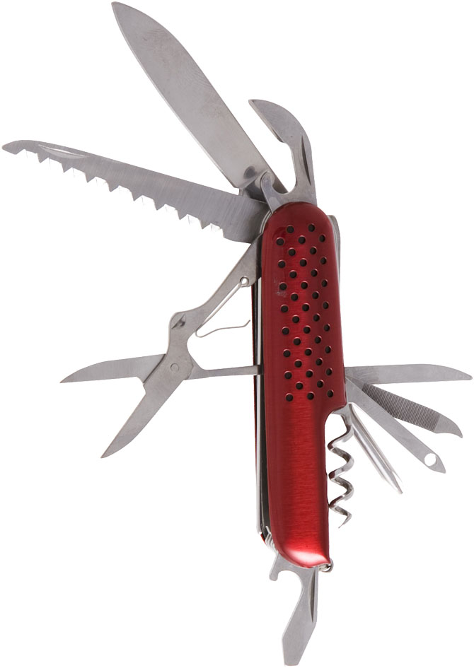 Tournevis plat et cruciforme, ouvre-boite décapsuleur, couteau, scie, écailleur, dégorgeoir, ciseaux, poinçon, lime à ongles cure-ongles, tire-bouchon, passe-fil et anneau.