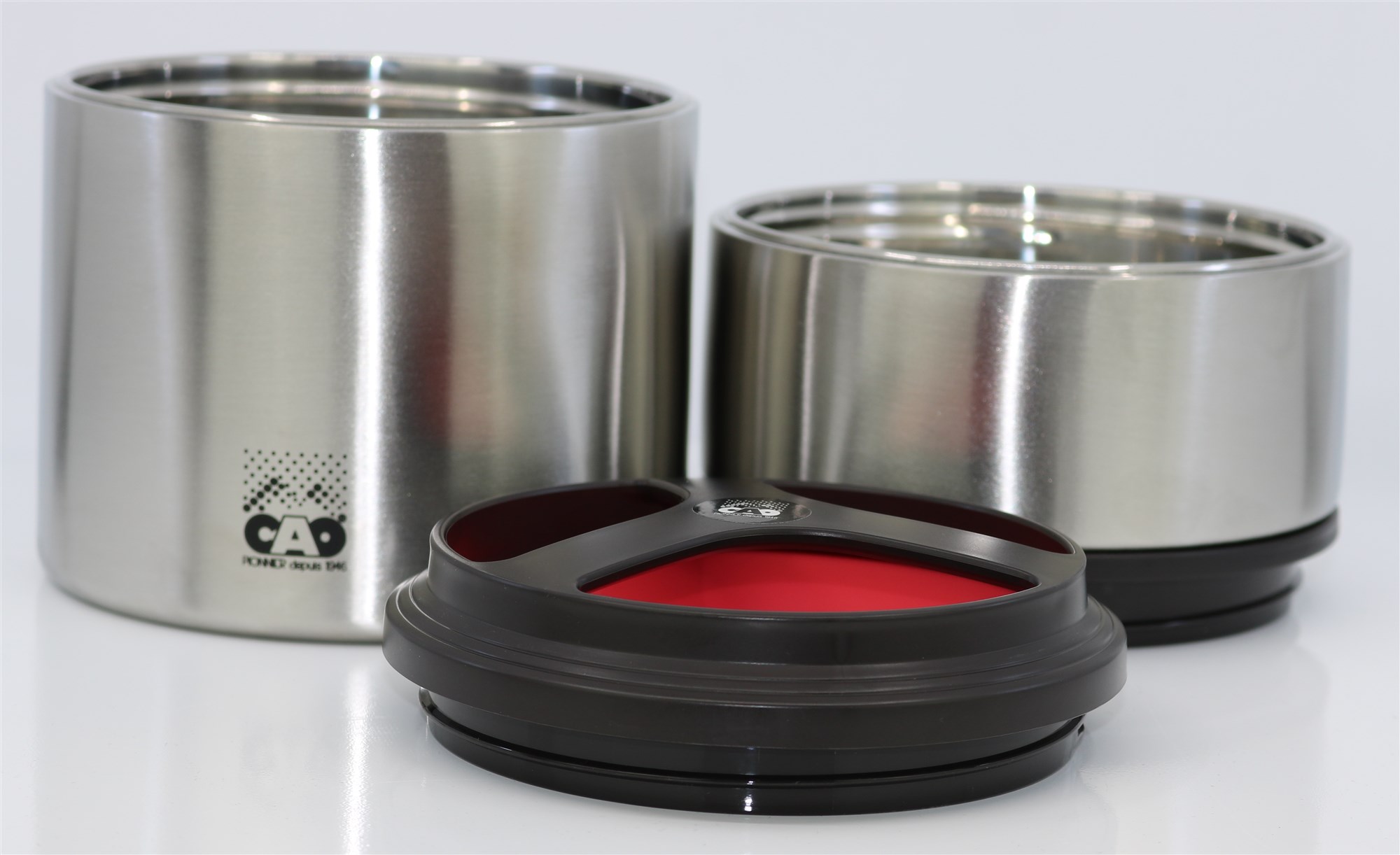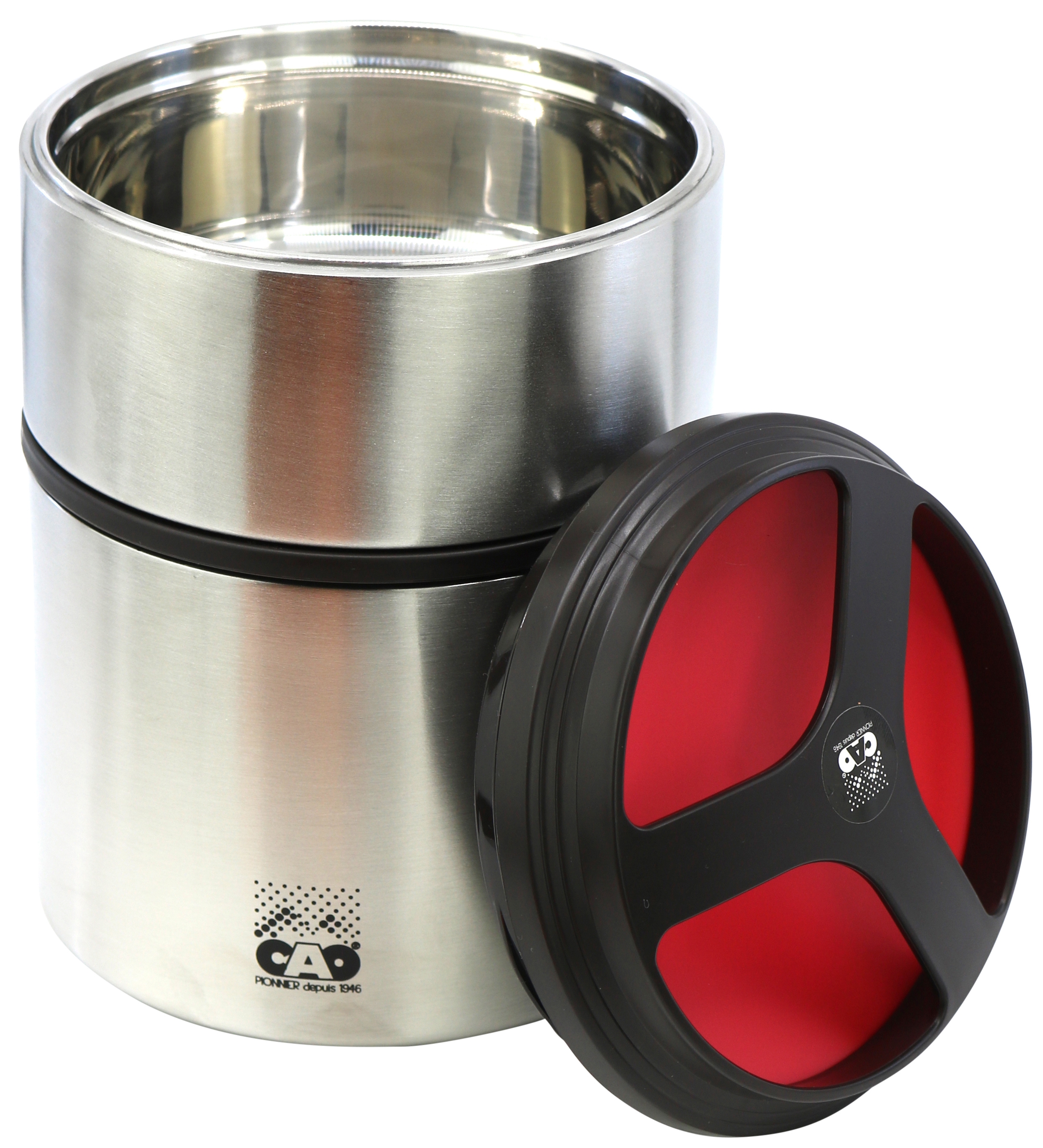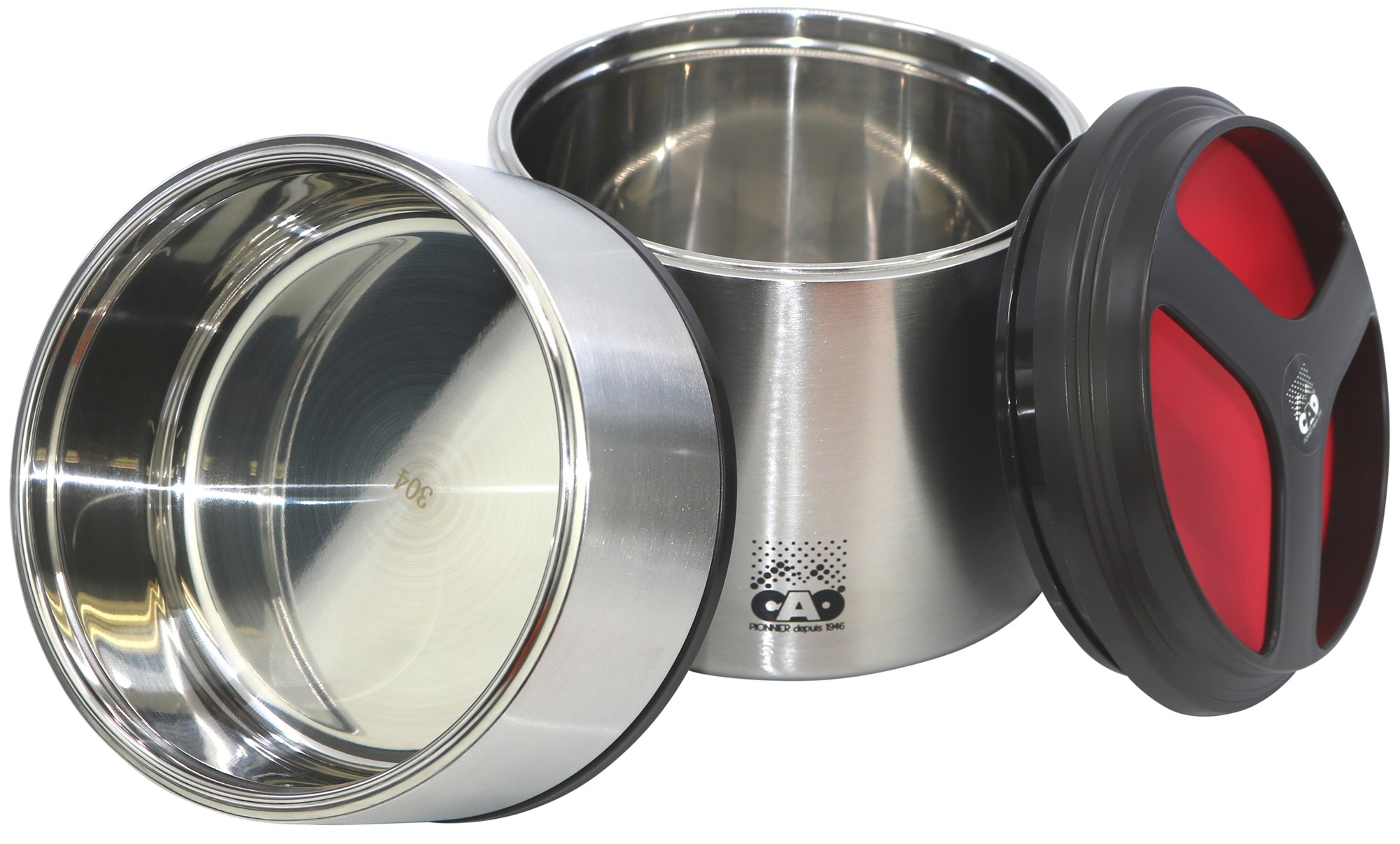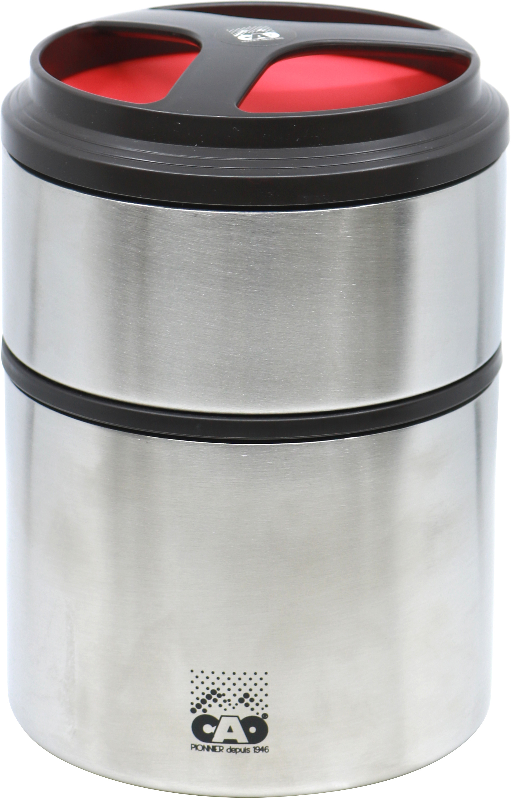 Boite alimentaire double paroie en acier inoxydable, composée de deux compartiments fermant par un couvercle étanche vissé et muni d'une poignée de transport.