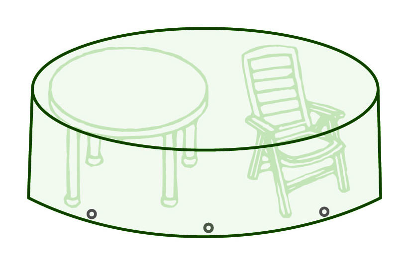 Pour protection table ronde avec chaises ou fauteuils. Inaltérable, avec œillets pour attache par sandow ou cordeau.