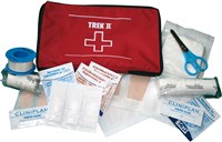 Trousse avec passant ceinture, comprenant : 1 mode d'emploi, 1 bande extensible 5cmx3m, 1 bande extensible 10cmx3m, 1 paquet de 5 compresses, 6 pansements adhésifs 6x2cm, 2 pansements adhésifs 6x4cm, 2 pansements adhésifs 4x2cm, 2 tampons Chlorhexidine, 2 tampons calendula, 2 tampons alcool à 70%, 1 sparadrap sécable, ciseaux, 1 pansement adhésif 10x6cm (à découper).