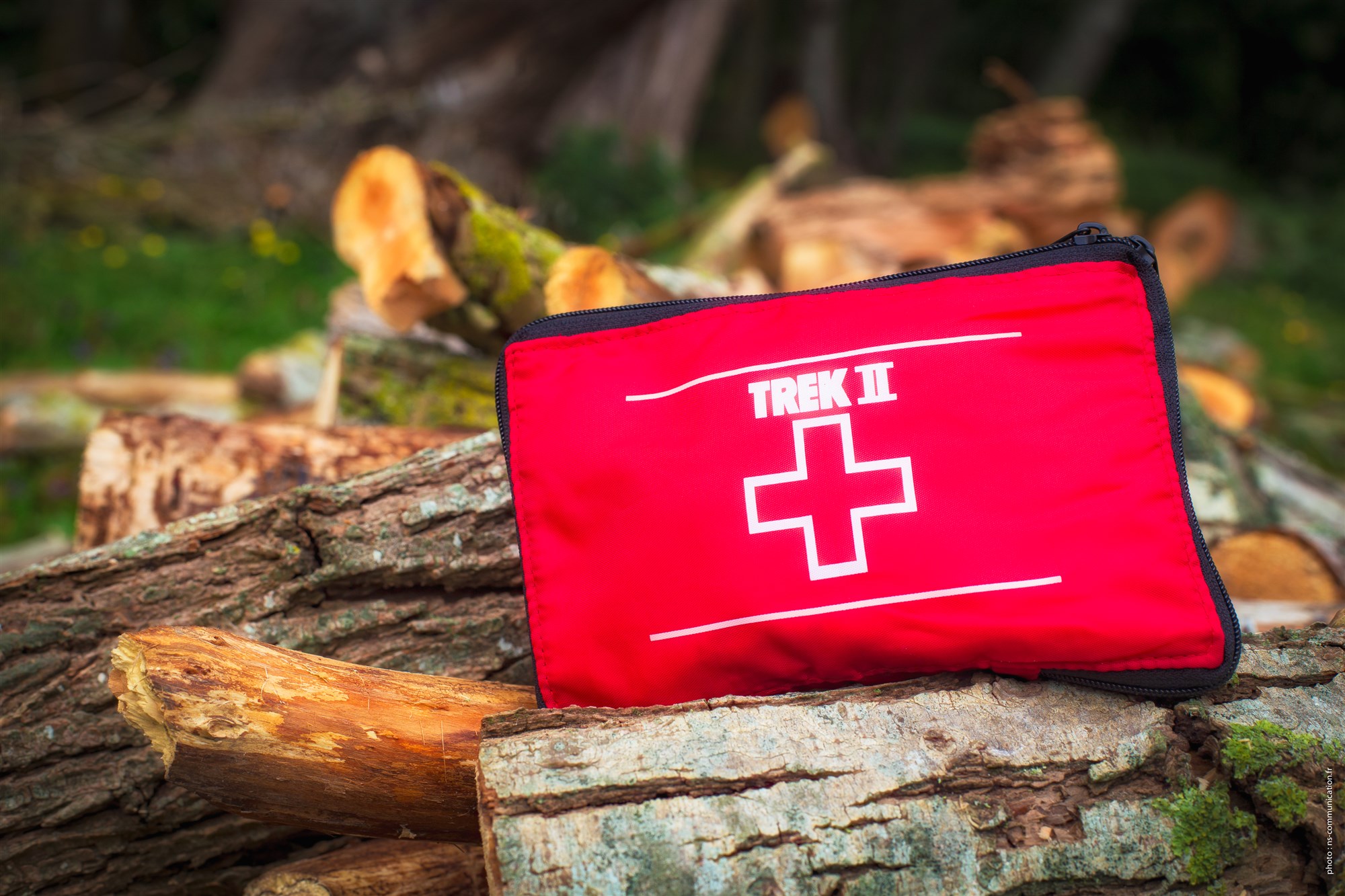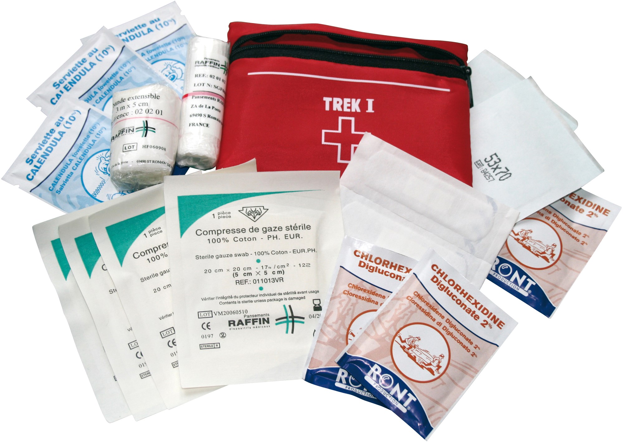 Trousse avec passant ceinture, comprenant : 1 mode d'emploi, 4 compresses 20x20cm, 1 bande extensible 5cmx3m, 1 bande gaze 7cmx3m, 3 tampons Chlorhexidine, 3 tampons calendula, 3 pansements adhésifs 6x2cm, 2 pansements adhésifs 6x4cm, 2 épingles à nourrisse, 1 pompe à venin.