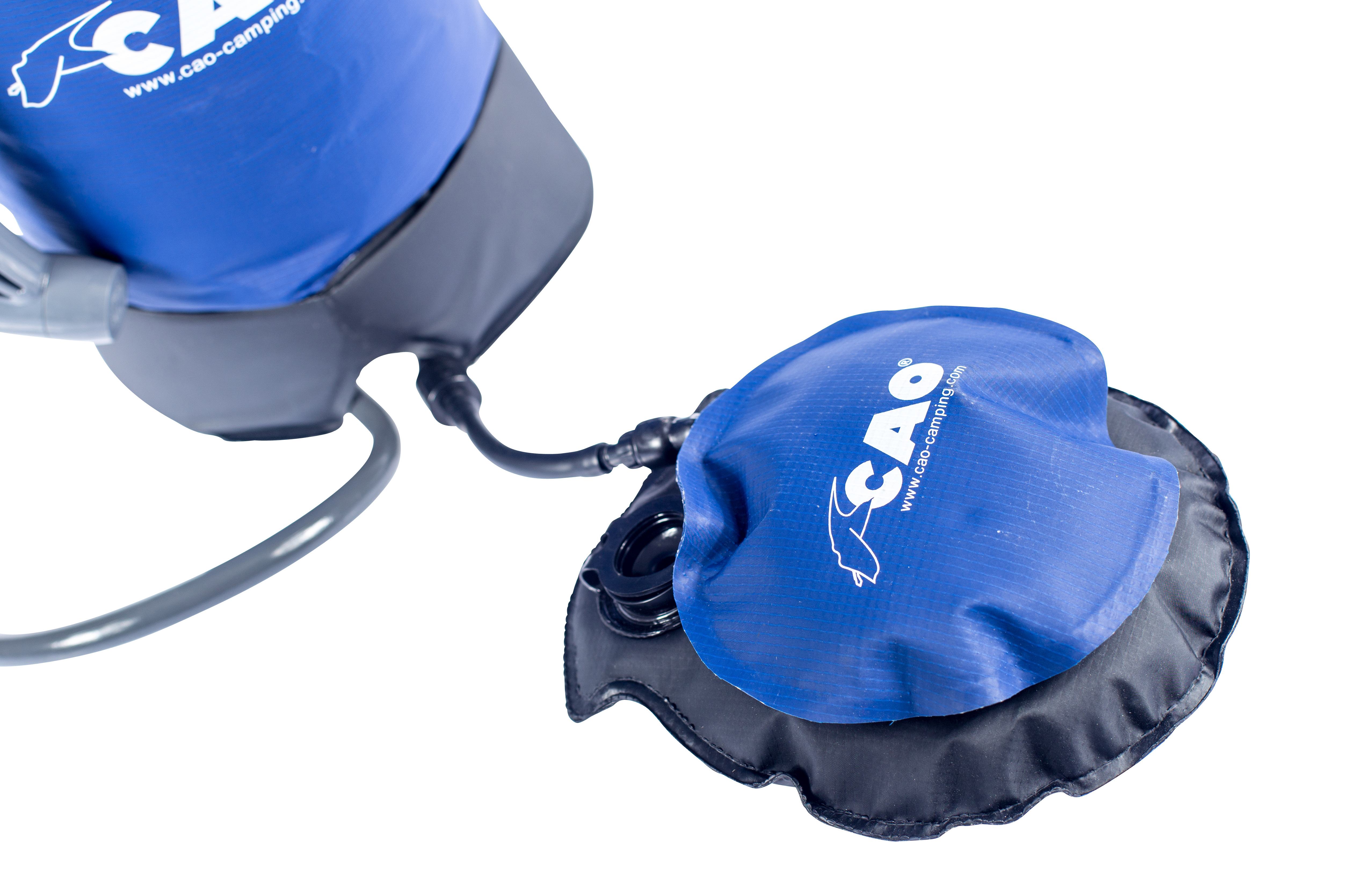 une pompe à pied envoie de l'air dans le réservoir souple, petit à petit, la pression monte et l'eau peu alors remonter le tuyau jusqu'à la douchette !