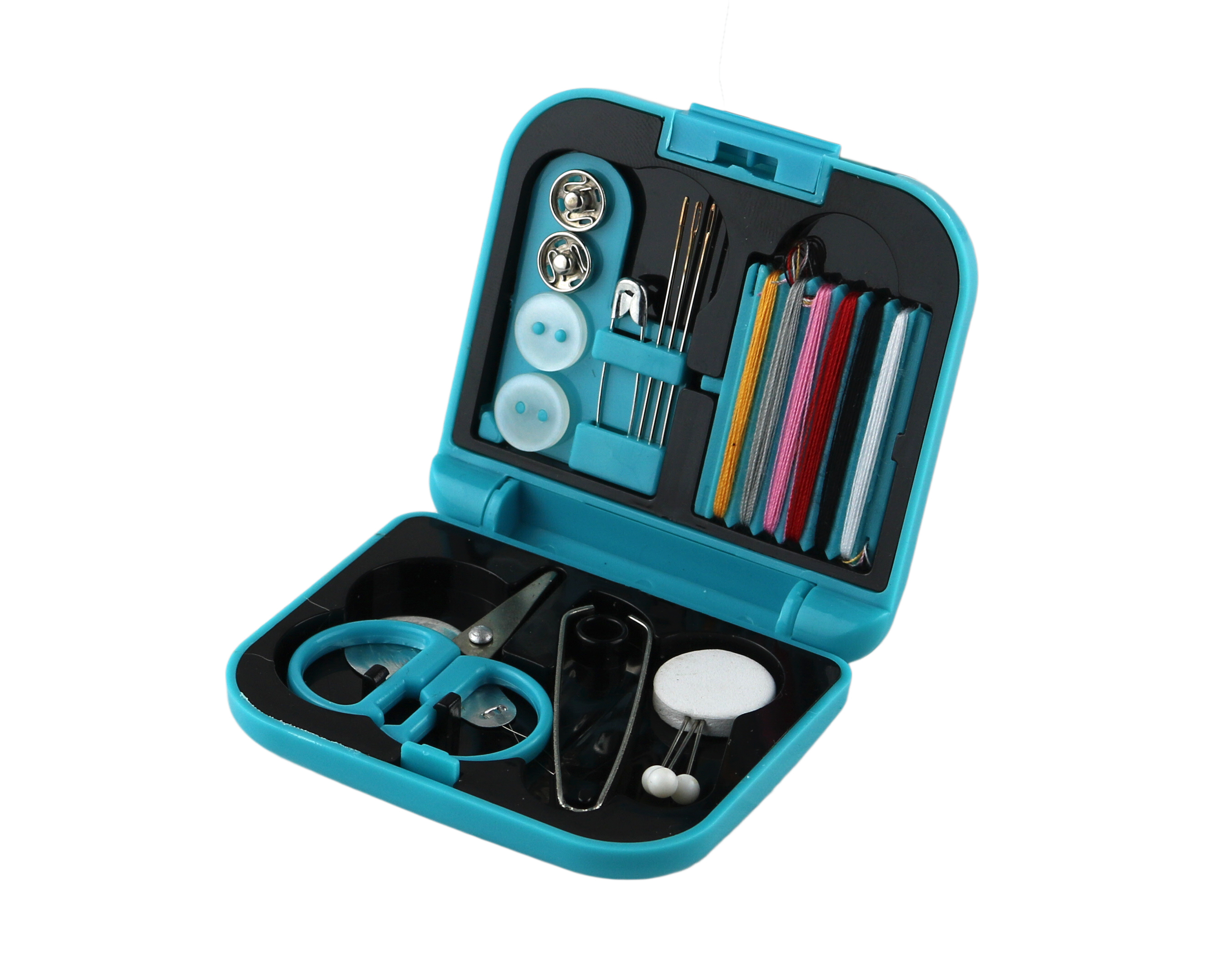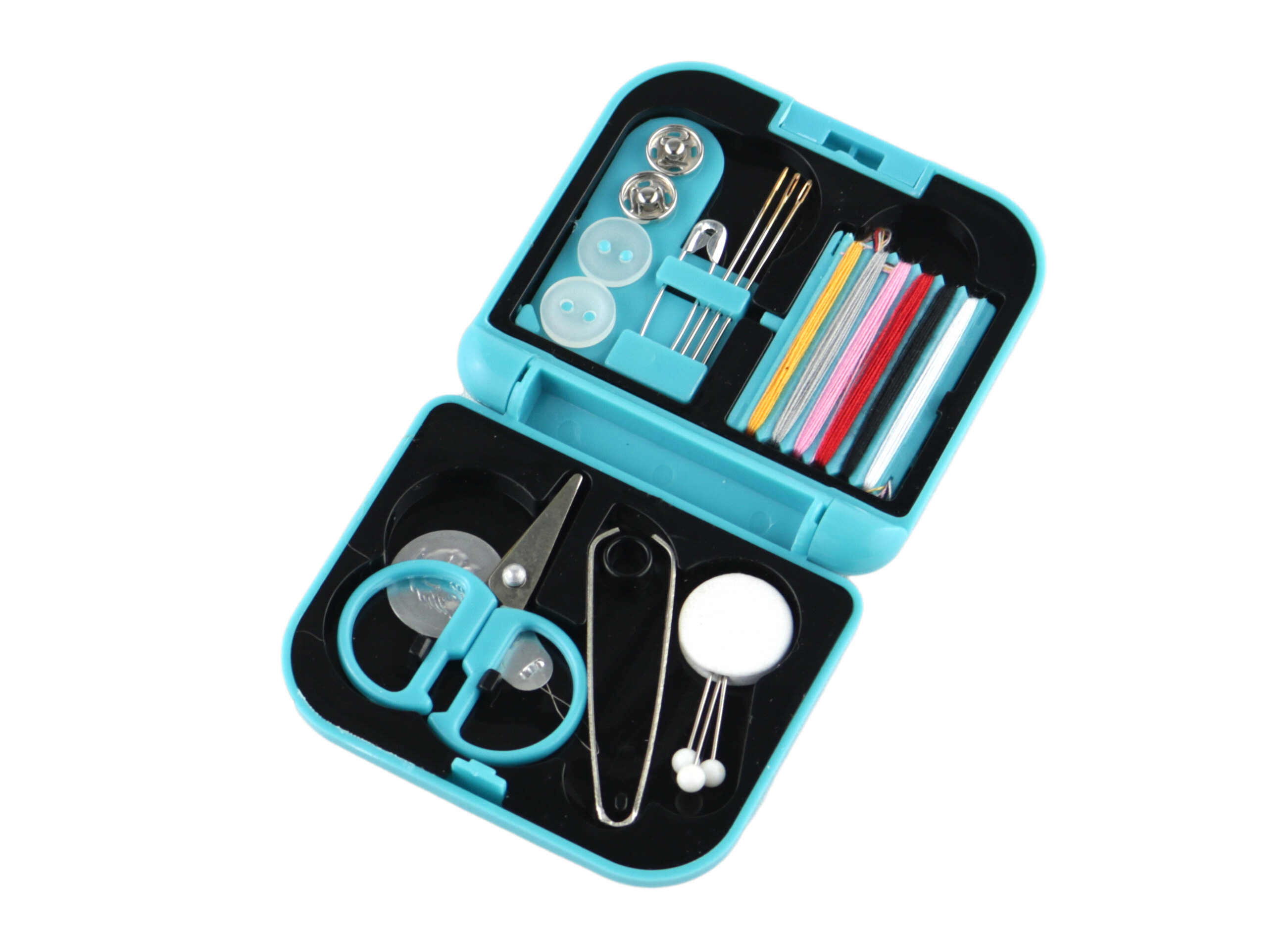 Mini trousse comprenant : 8 jeux de 2 aiguilles en boite, 12 bobines fil blanc + couleurs, passe-fil, épingles de sûreté, boutons, ruban-mètre de mesure long.