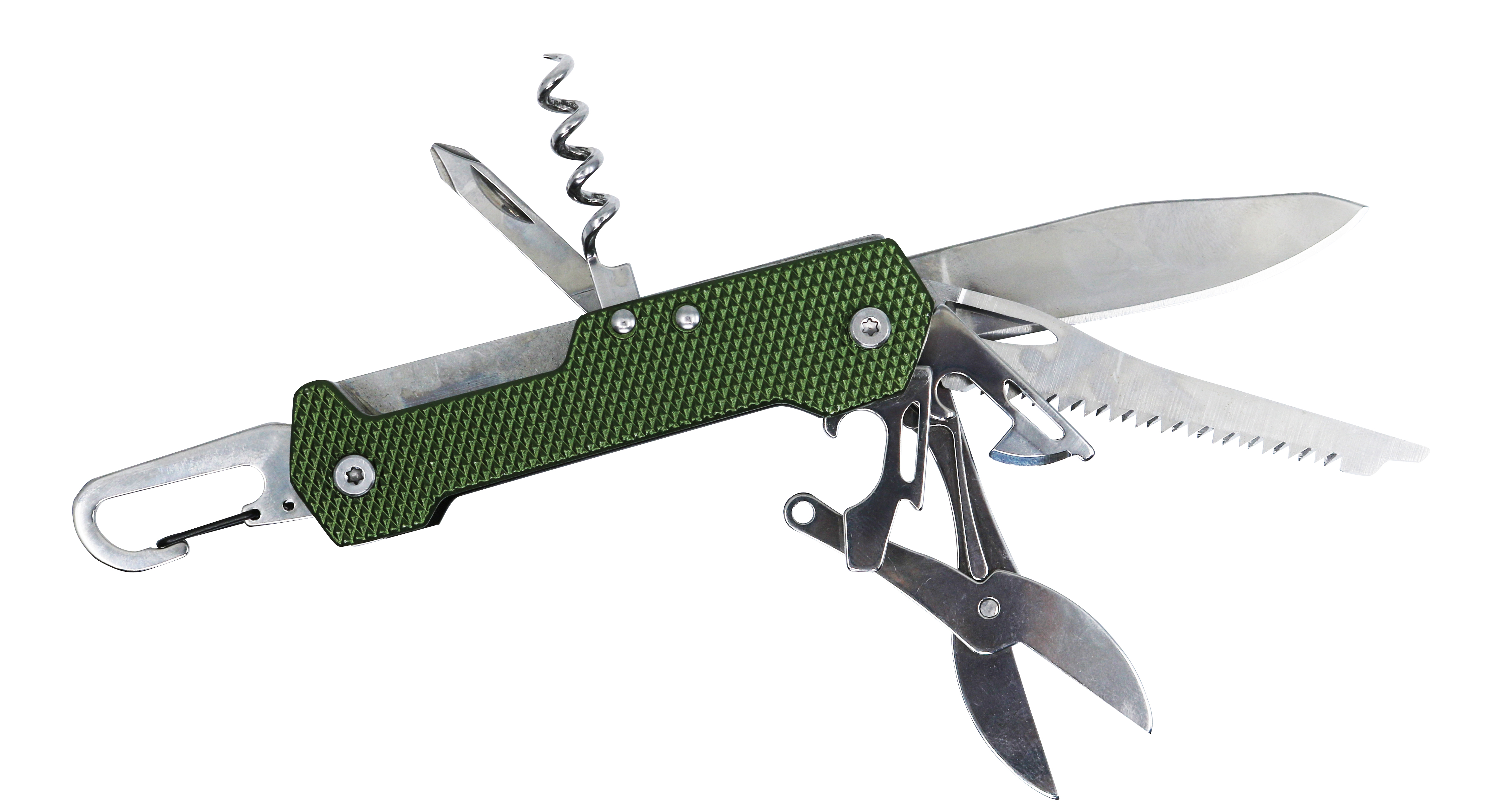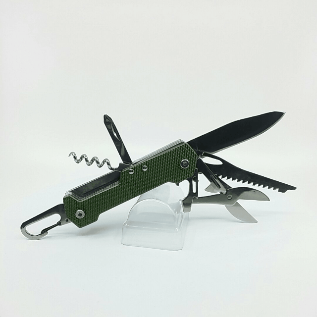 9 fonctions : couteau, ciseaux, ouvre-boite, décapsuleur, tournevis plat et cruciforme, scie, tire-bouchon, mousqueton.