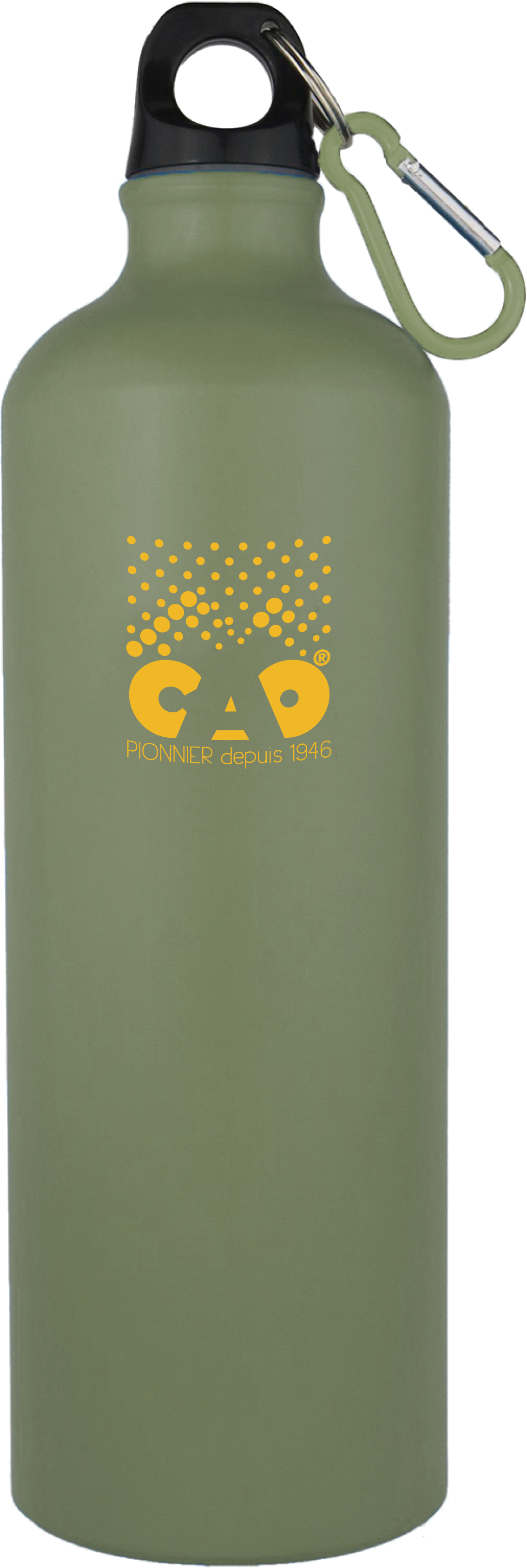 GOURDE "POP" 1 litre Aluminium Kaki H 27 cm ø 8 cm Avec anneau brisé et mousqueton. Bouchon vissant rentrant. Revêtement alimentaire intérieur. 1 litre 145 g