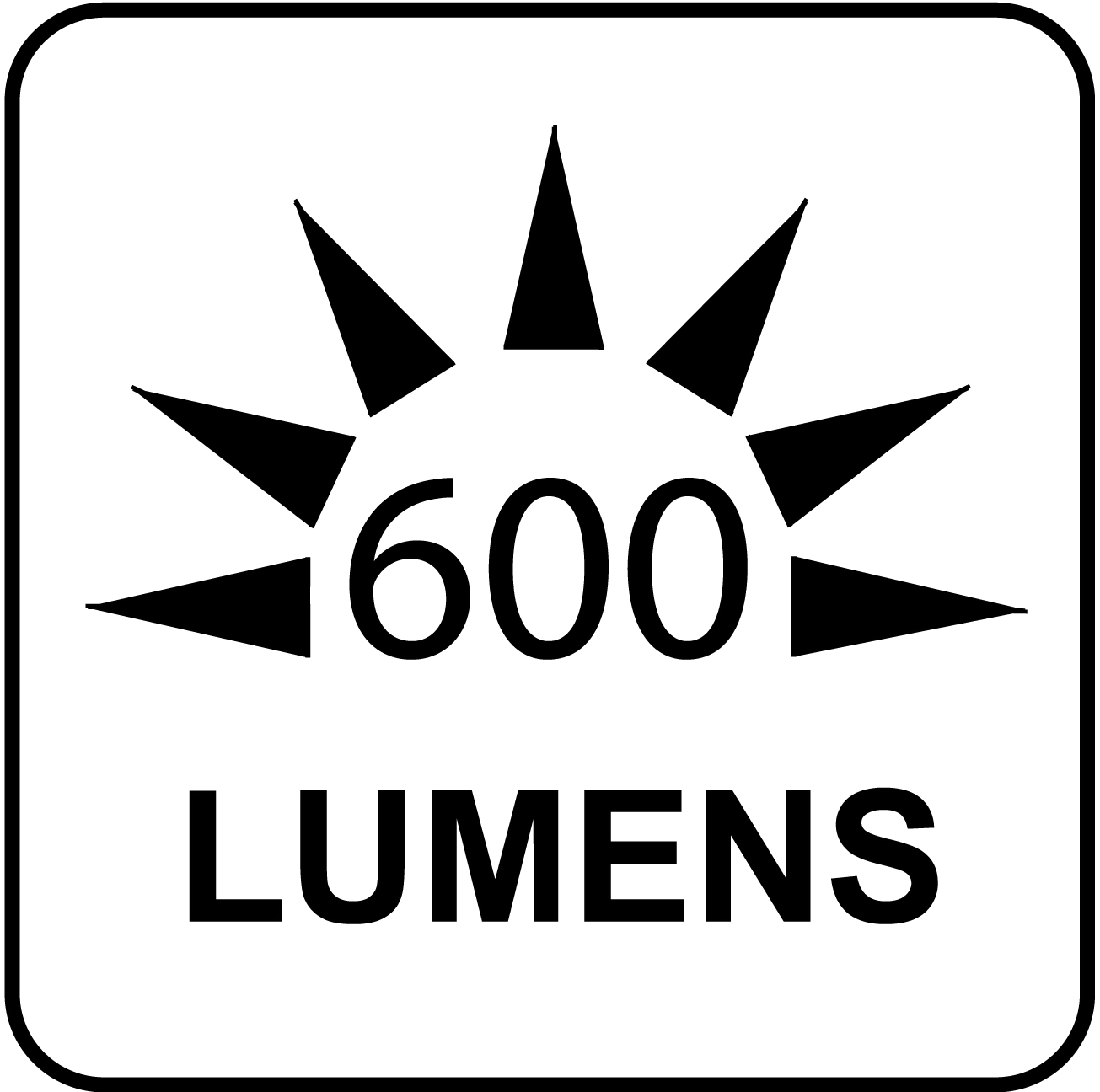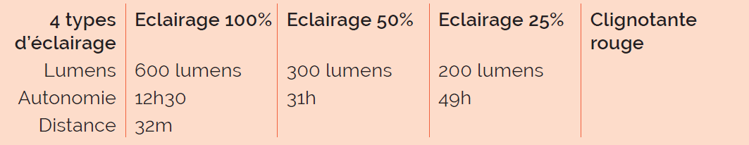 Peut être utilisée à l’intérieur comme à l’extérieur. 4 types d'éclairage: 100% (600 lumens - 12h30 d'autonomie - éclairage à 32m), 50% (300 lumens - 31h d'autonomie - éclairage à 16m), 25% (200 lumens - 49h d'autonomie - éclairage à 8m) et fonction clignotante rouge. 15W led COB 600 lumens