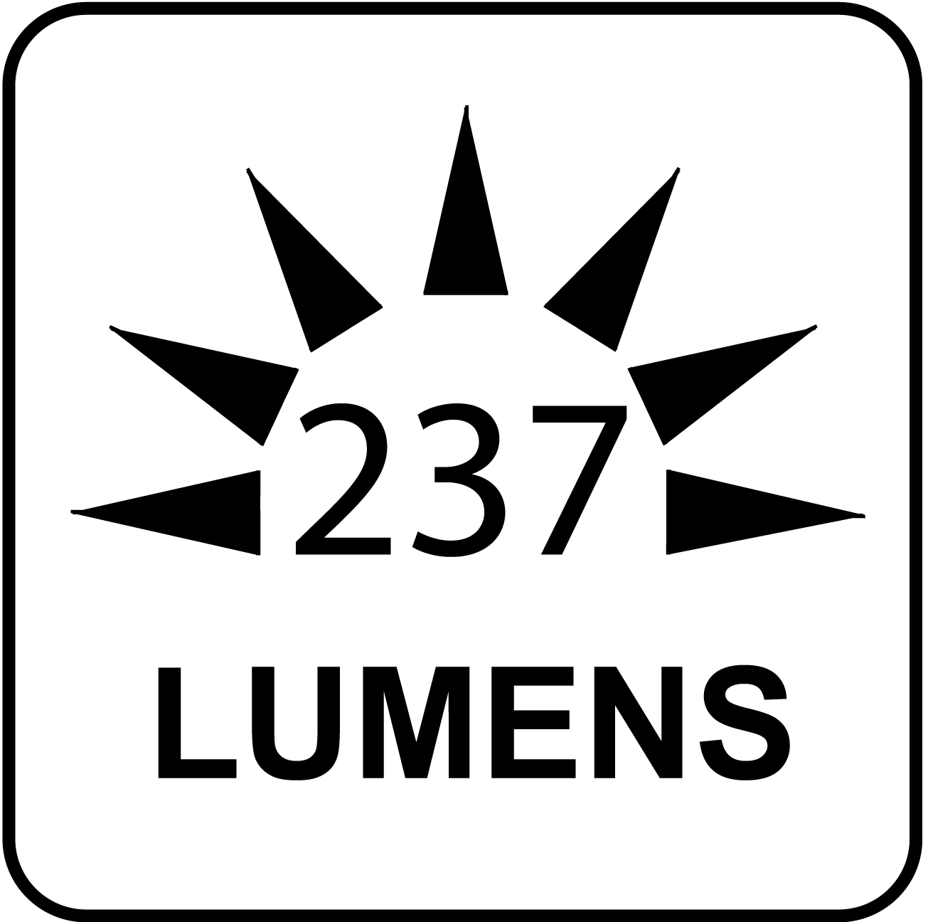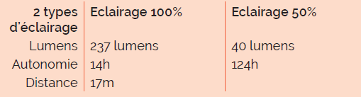 2 types d'éclairage: 100% (237 lumens - 14h d'autonomie - éclairage à 17m) et 50 % (40 lumens - 124h d'autonomie).